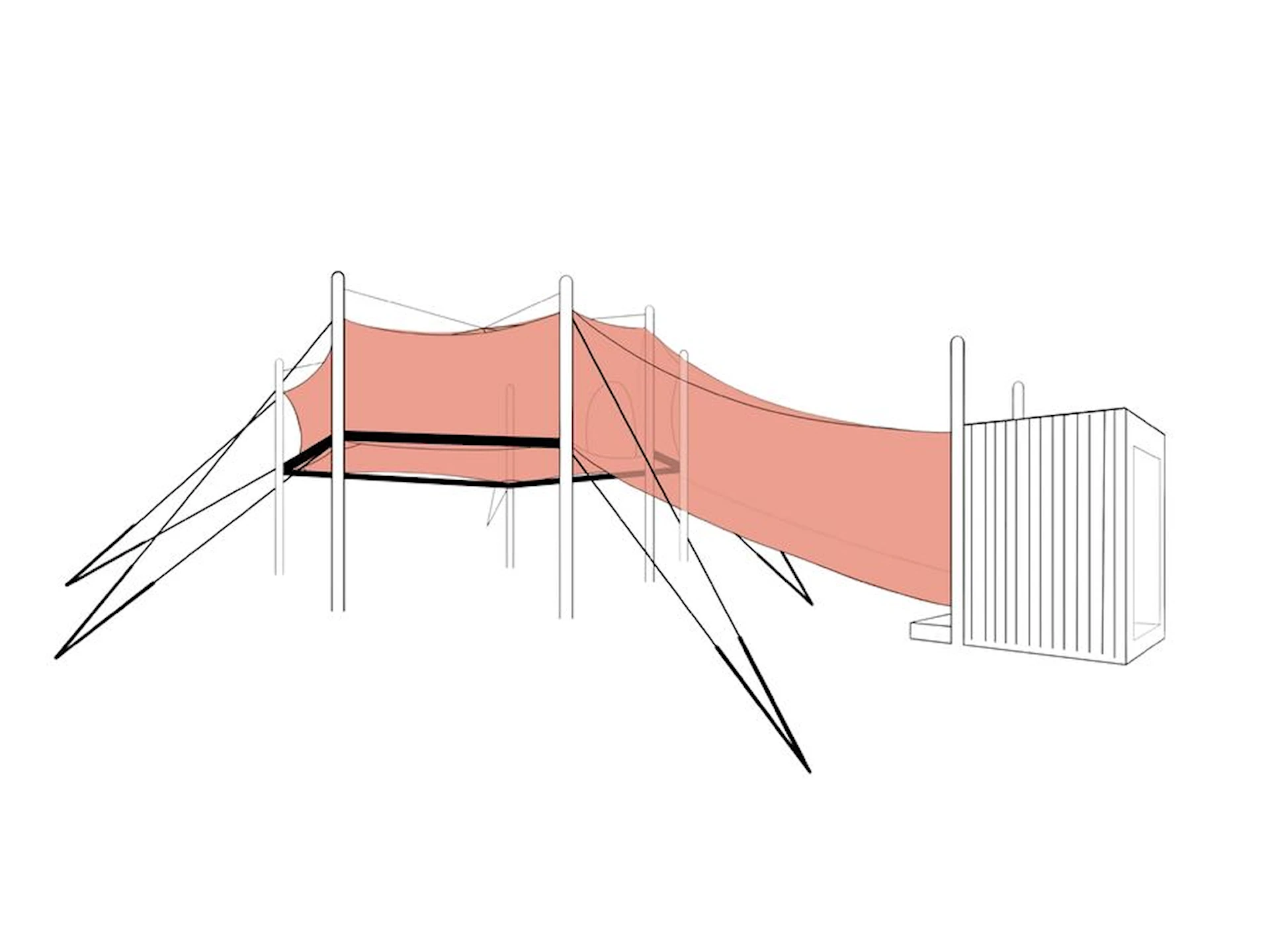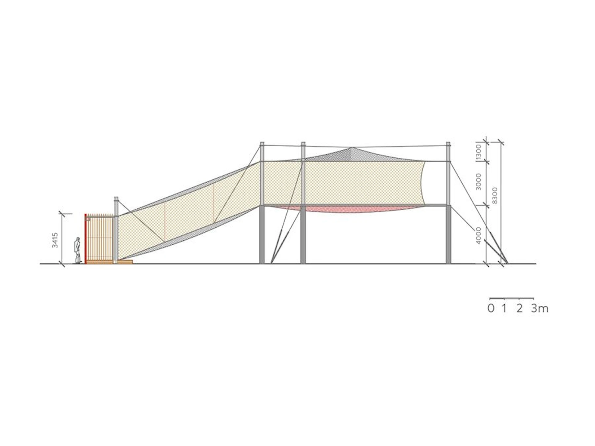 Sikkerheden er integreret i designet. Gulvet er opbygget i tre netlag, og hele opholdsfladen er omsluttet af beskyttelsesnet. Konstruktionen fremstår fortsat let og transparent, samtidig med at den skaber en tryg ramme for ophold i højden.