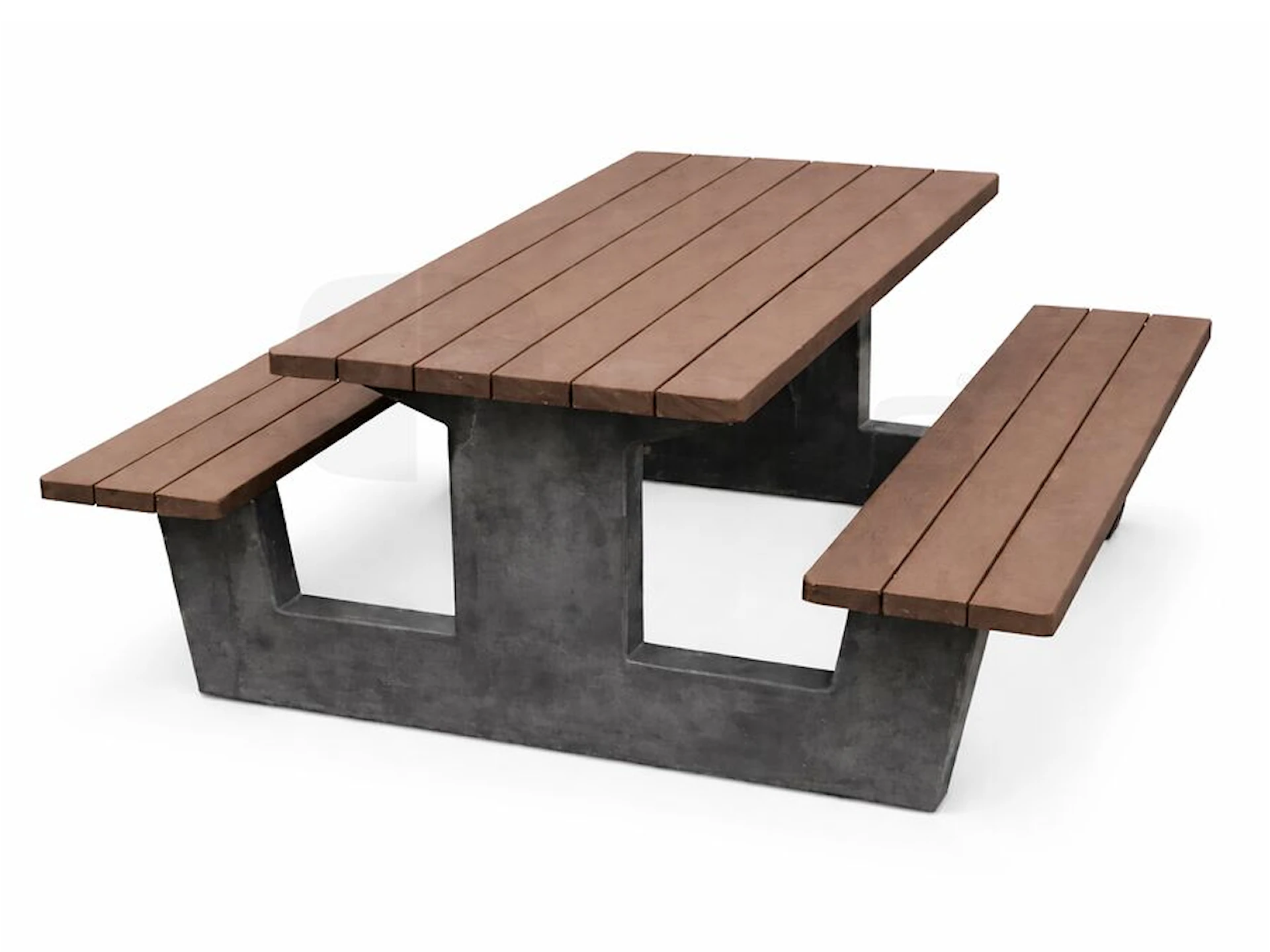 Bord og sæder leveres færdigsamlede og sættet er forberedt til fast montering på underlag. Monteringen tager ca. 40 minutter. Fås i sort, brun eller grå plast. En robust løsning til daglig brug i det offentlige rum.