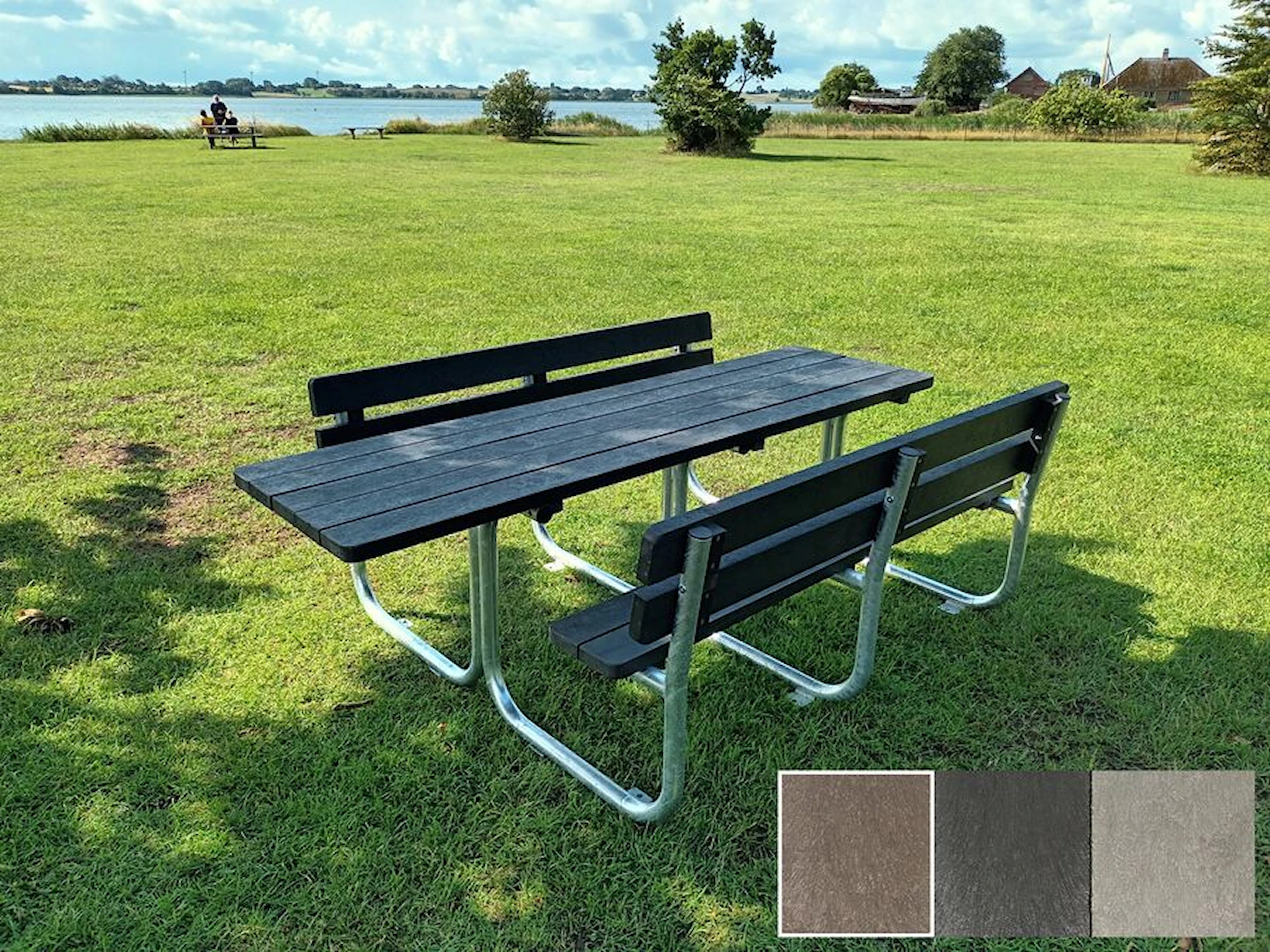 Bord og bænke fås i sort, brun eller grå.