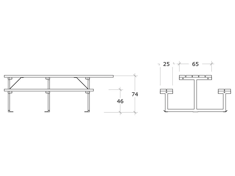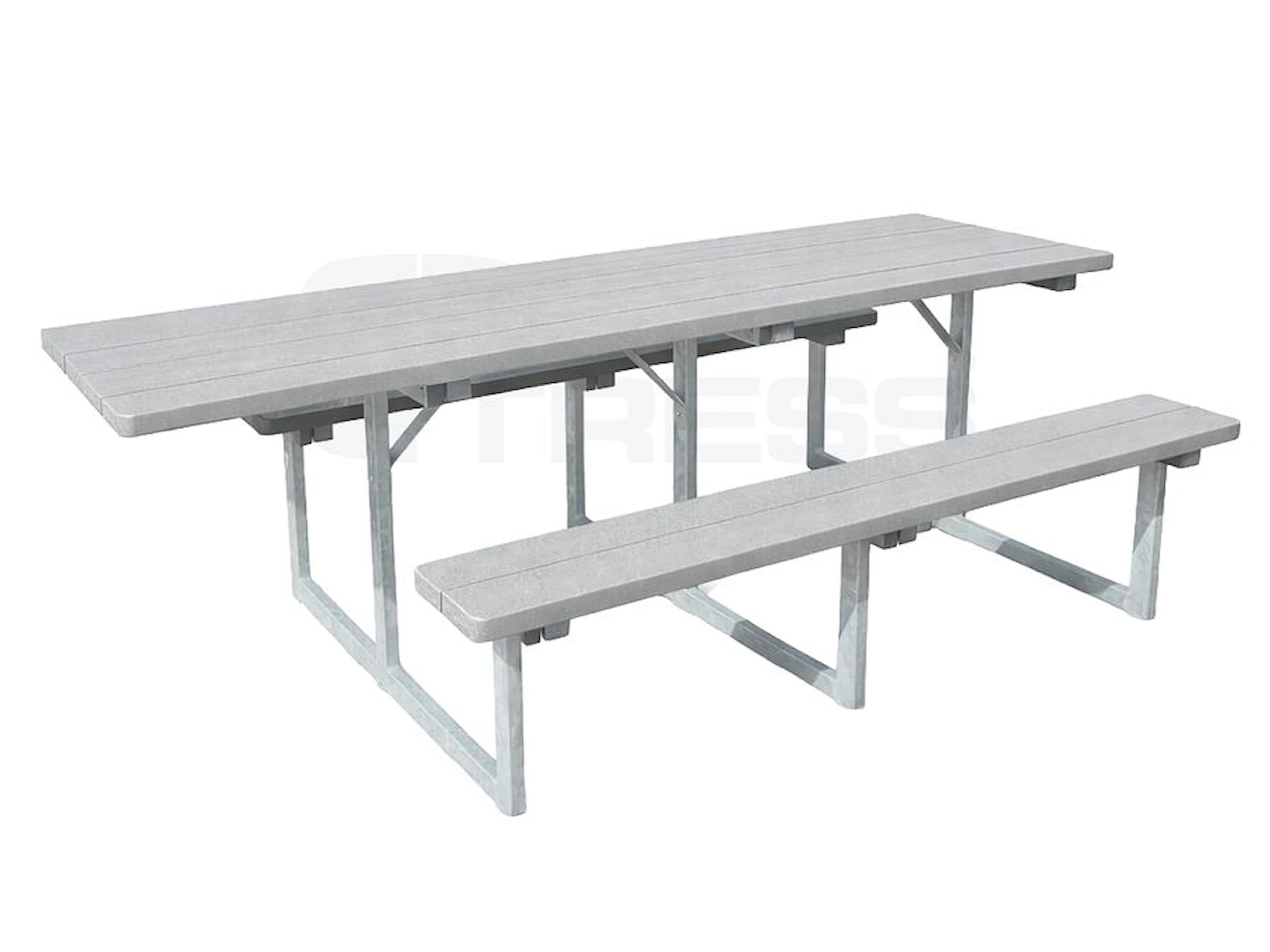Består af ét bord og to bænke uden ryglæn. Stellet er i varmgalvaniseret stål med profil 30 x 50 mm. Plankerne er i massiv genbrugsplast med dimensionerne 40 x 120 mm. Overfladen er gennemfarvet, splintfri og kræver ikke vedligehold.