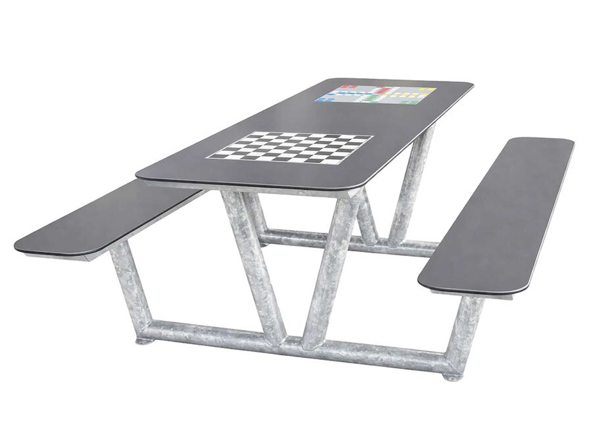 Sæder og bordplade er udført i 9,5 mm tyk HPL, der er fastmonteret direkte på stellet. Valget af HPL sikrer en overflade, der er modstandsdygtig over for både slid og skiftende vejrforhold uden behov for vedligeholdelse. De påtrykte spilleplader til ludo og skak gør sættet til et naturligt samlingspunkt for både børn og voksne i pauser eller fritid.