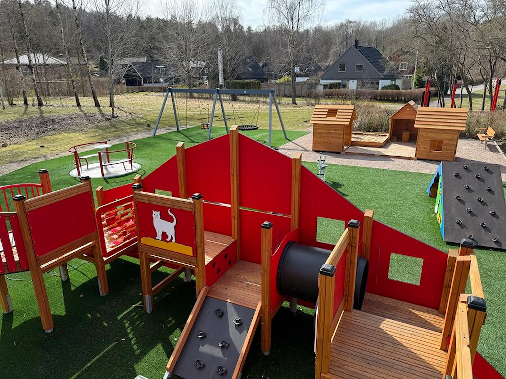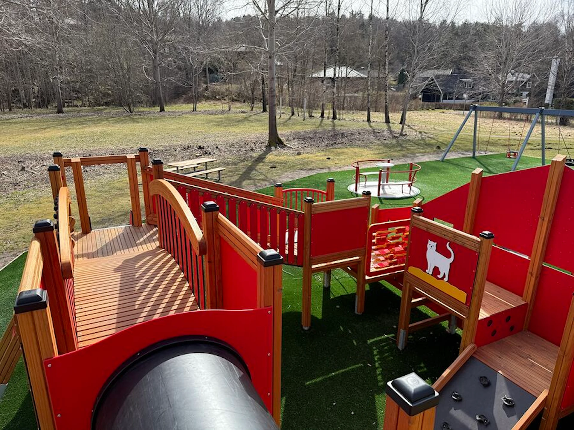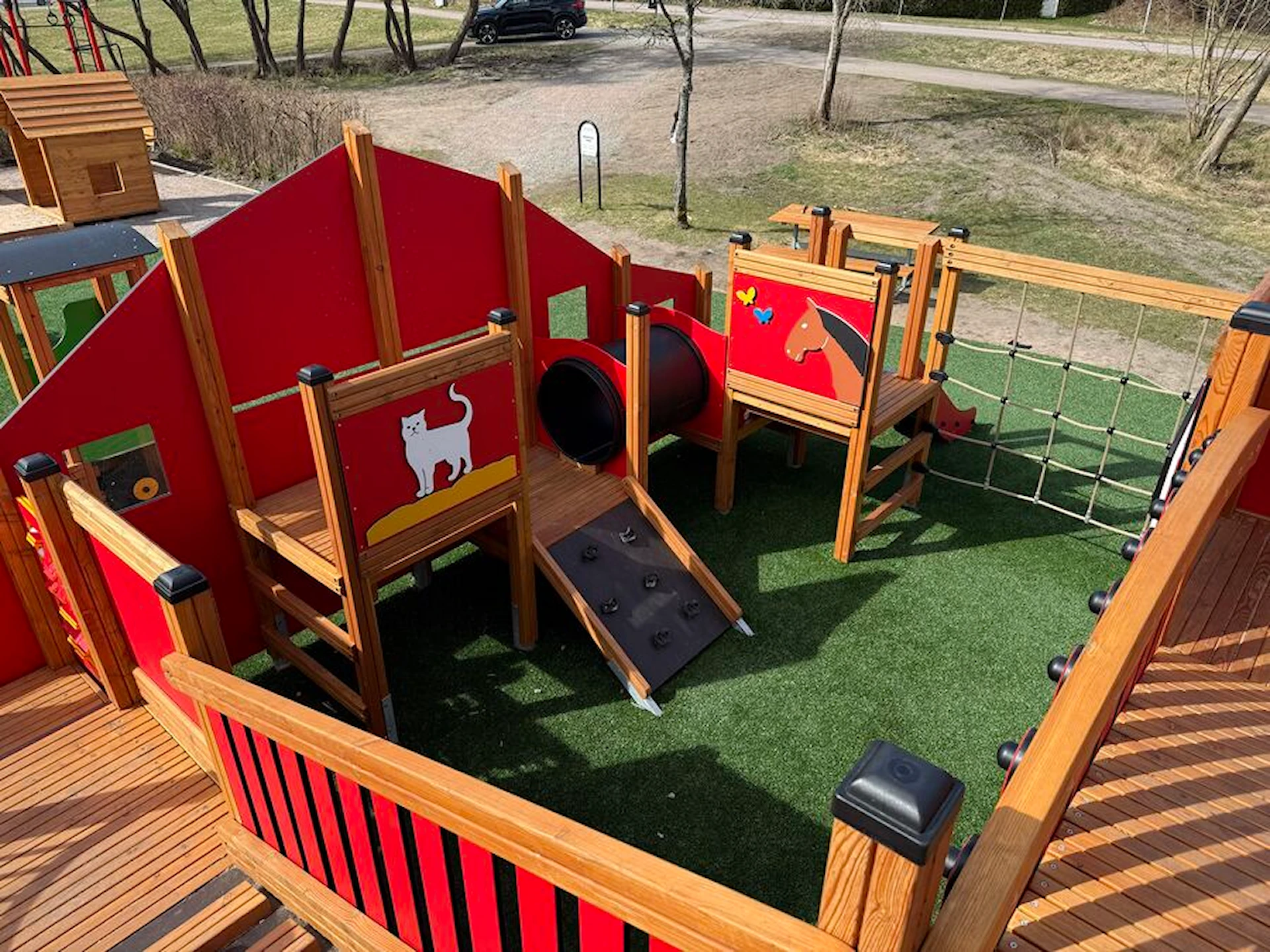 Temaet fungerer næsten som en teaterscene og gør legepladsen til en oplagt ramme for leg, samarbejde og fælles historier.