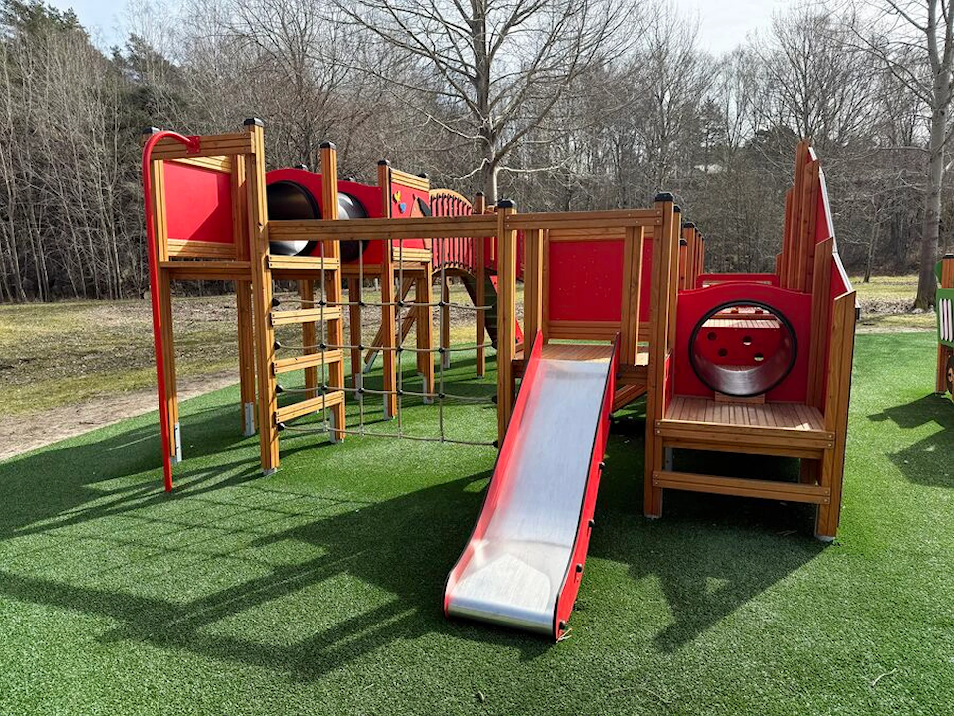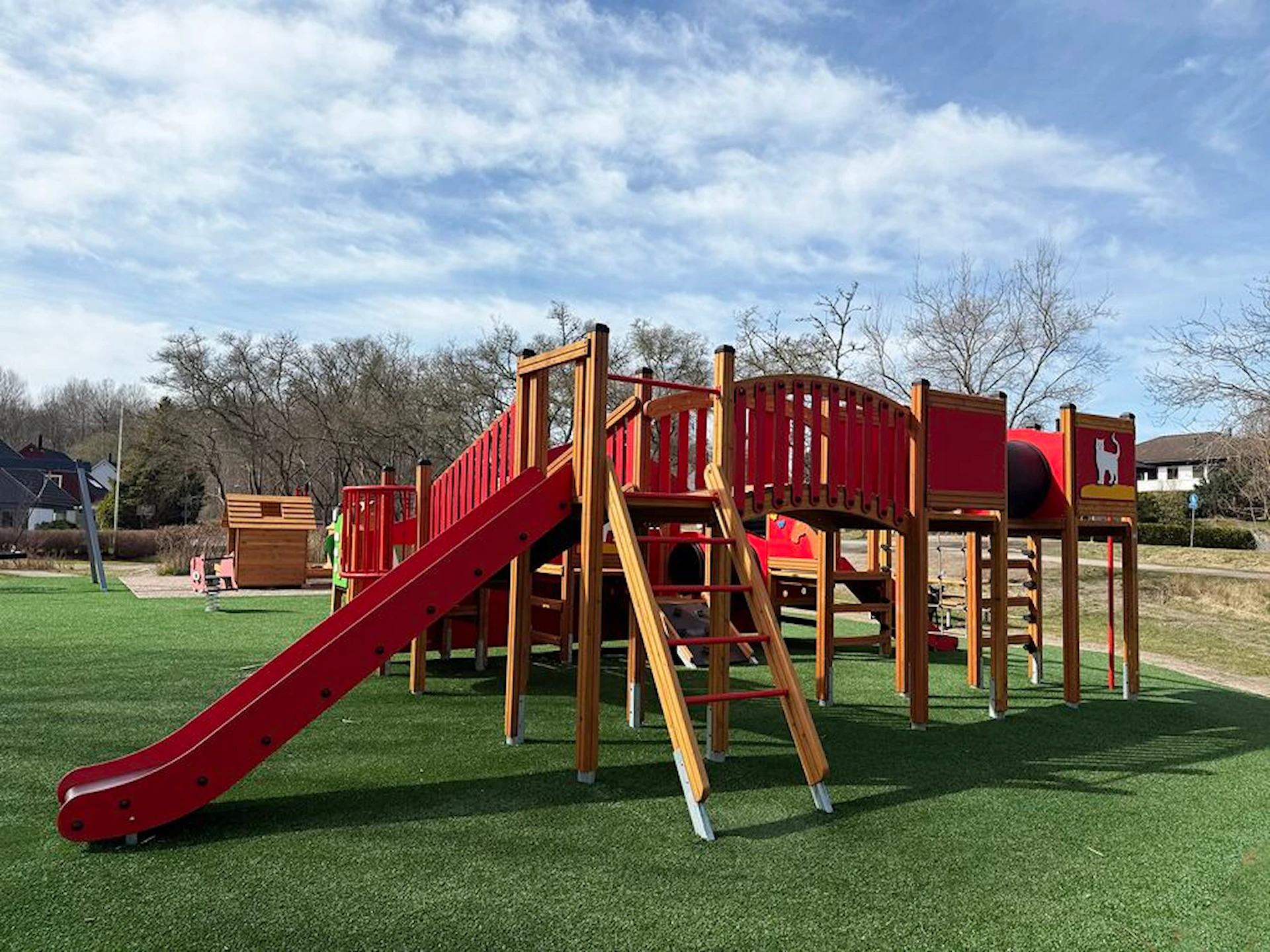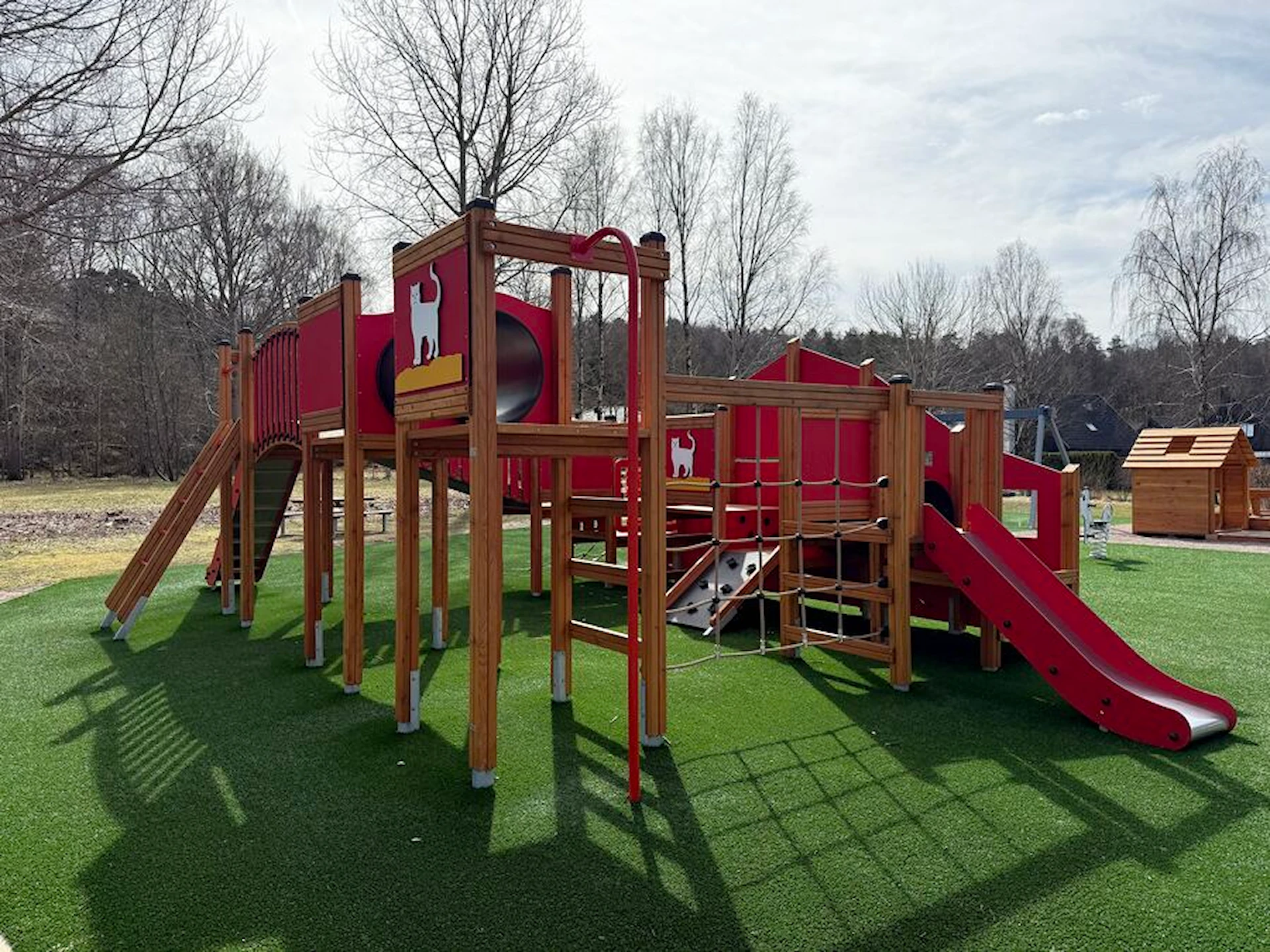 Temaet fungerer næsten som en teaterscene og gør legepladsen til en oplagt ramme for leg, samarbejde og fælles historier.