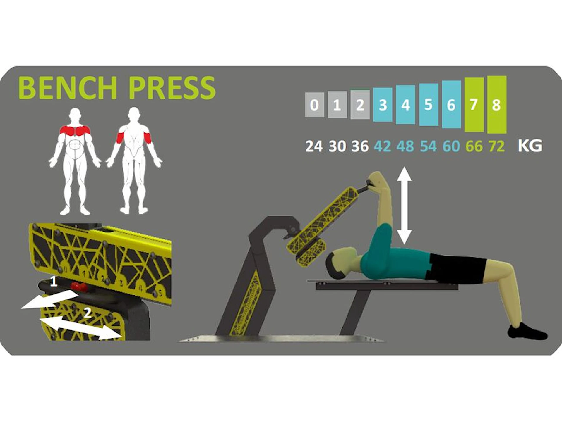 ElementFit Bench Press kan hjælpe med at udvikle og styrke brystmusklerne og triceps. Med hjælp af instruktioner på hver maskine får brugeren tips og øvelsesvejledning til at kunne træne korrekt.