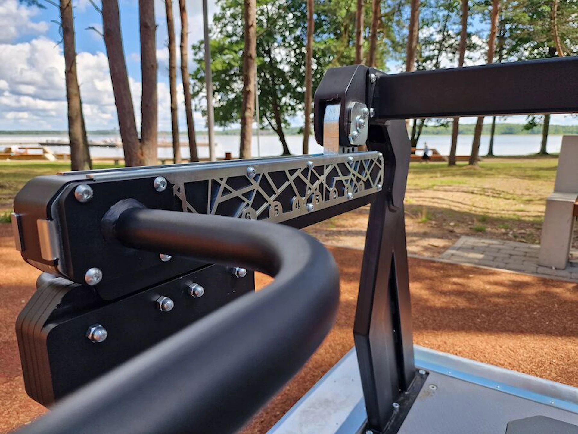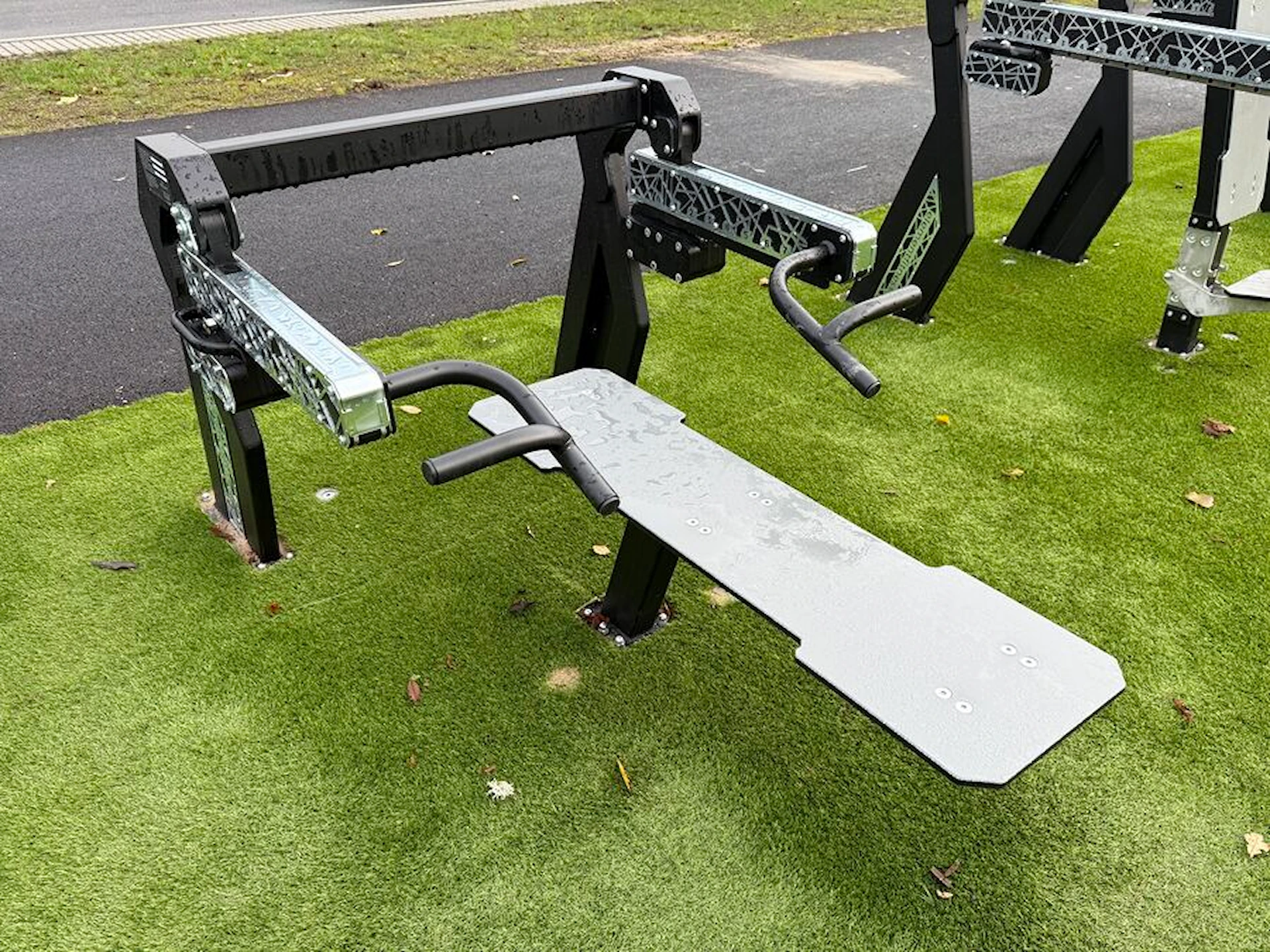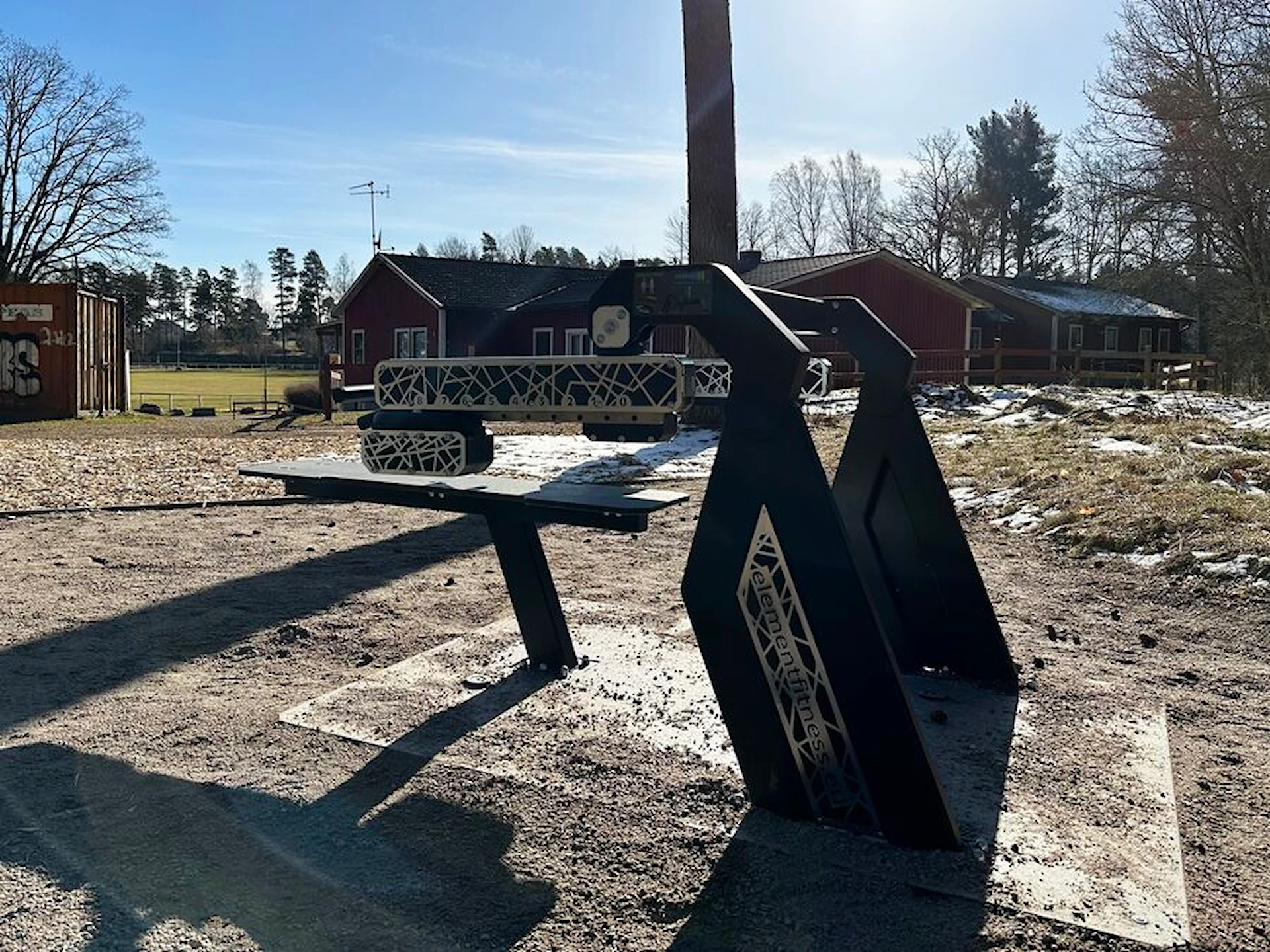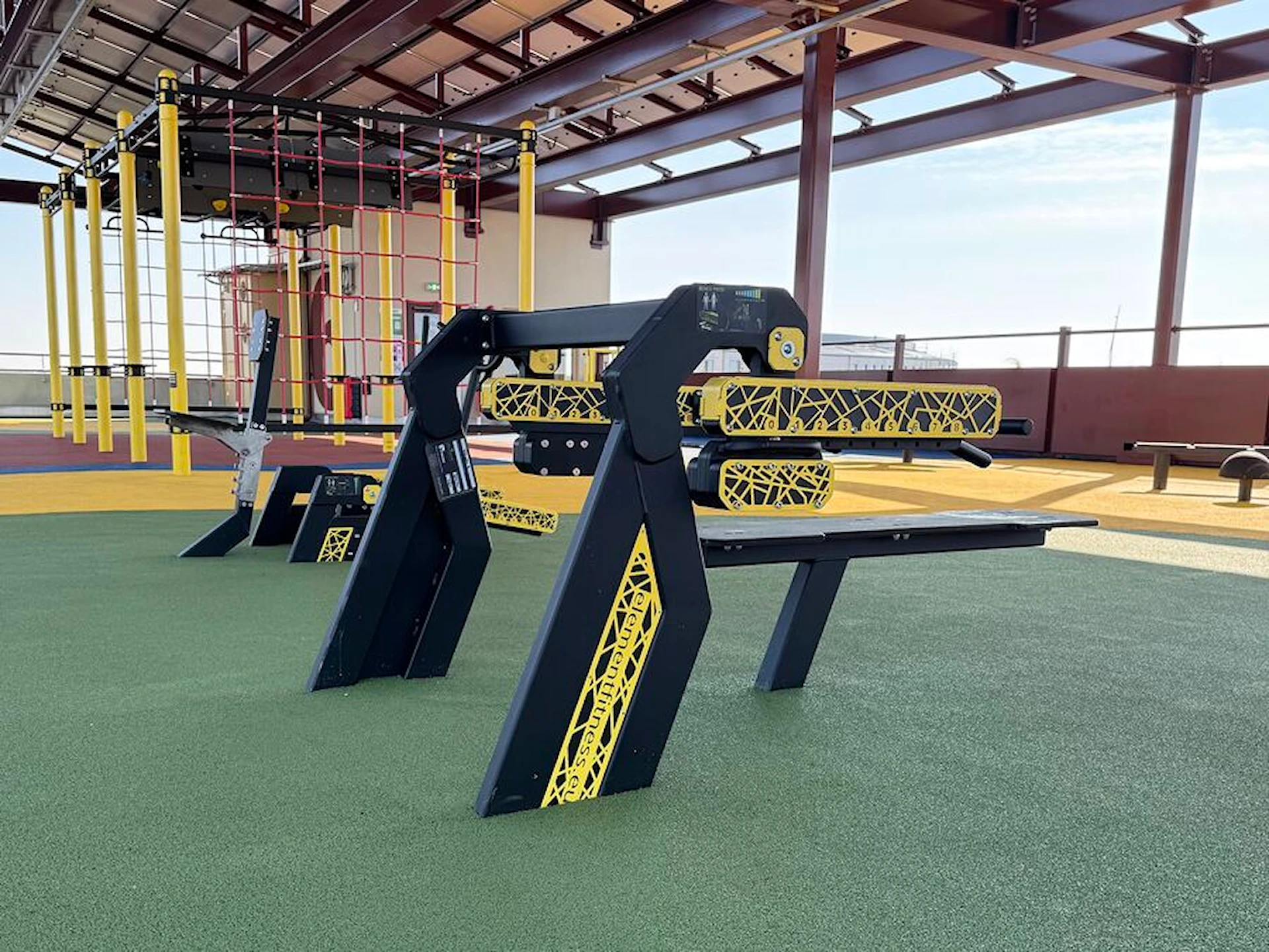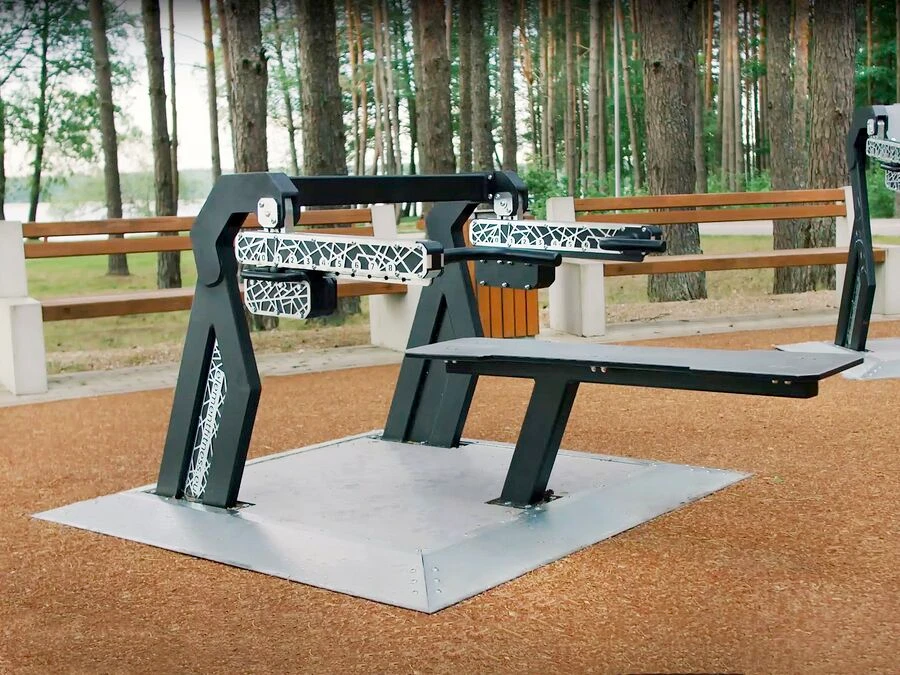 Det er nemt at skabe et inspirerende udendørs fitnessmiljø med ElementFit-træningsmaskinerne. Her kan der f.eks. suppleres med et multifunktionelt træningsstativ for også at give brugerne mulighed for funktionel træning.