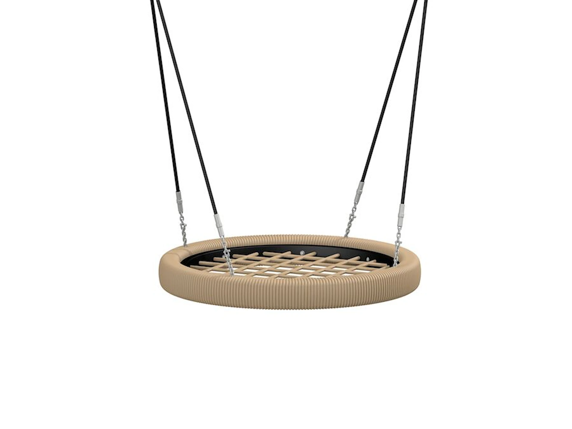 Gyngens ophæng er udført i 16 mm sort tovværk med indvendig stålkerne, der sikrer høj slidstyrke og lang levetid. Sædet er opbygget af forstærkede polypropylen-reb, som giver en blød, fleksibel og skridsikker overflade, der er behagelig at bruge og nem at vedligeholde. Midterdelen af sædet kan udskiftes separat, hvis den med tiden bliver slidt eller udsat for hærværk.
