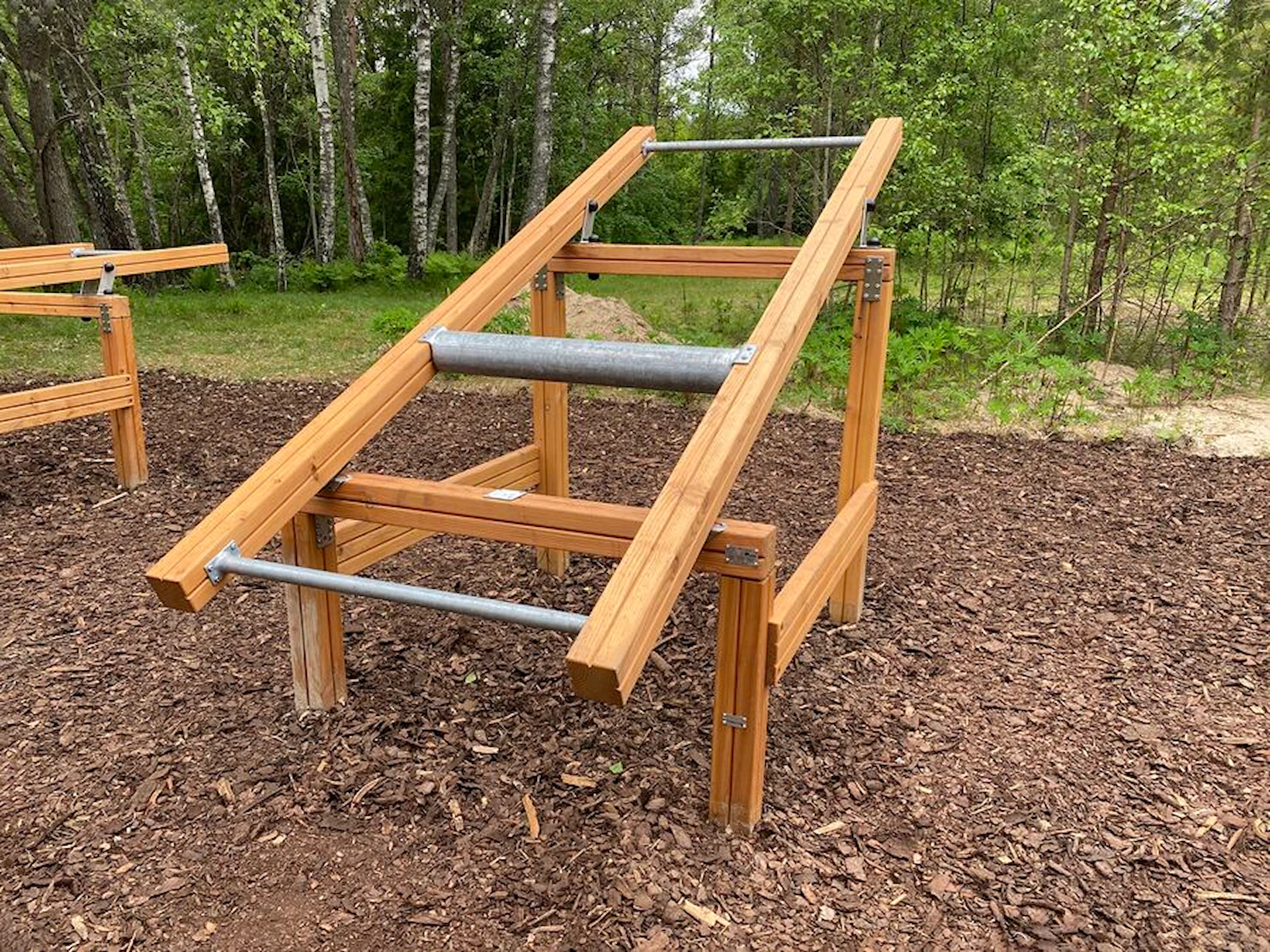 Knæbøj Wooden Fitness kombineres med andre moduler for at skabe et varieret og motiverende udendørs træningsområde, som inviterer til bevægelse og fællesskab.
