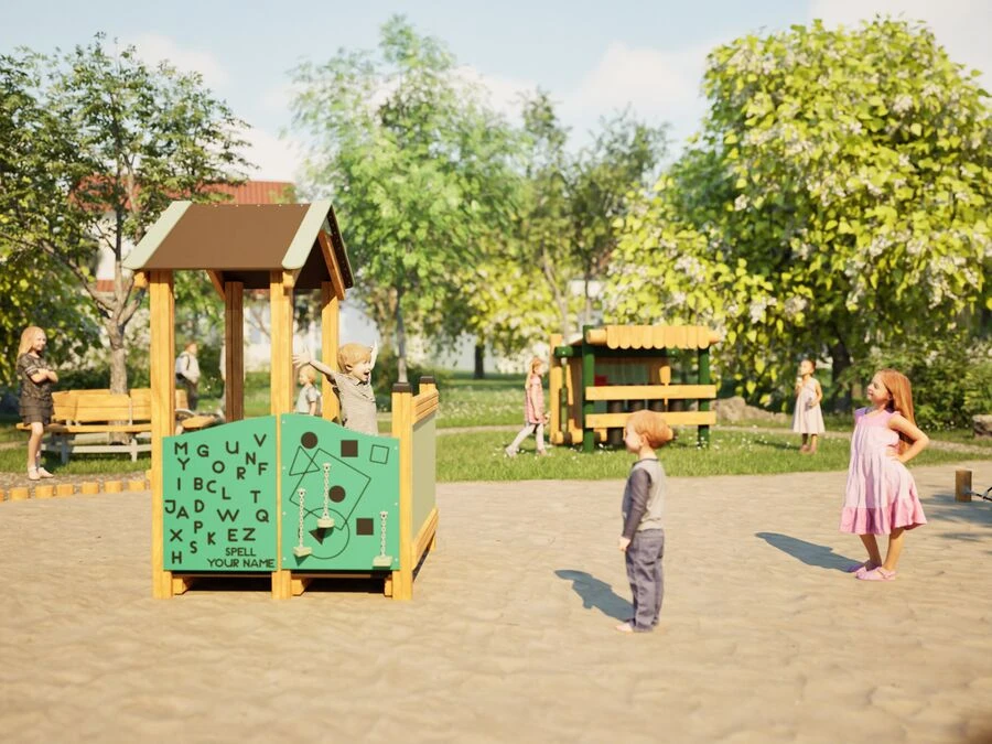 Legehuset er udstyret med pædagogiske og taktile legepaneler, som giver mulighed for at arbejde med bogstaver, bevægelige elementer og sansning. Det styrker finmotorik, sprog og nysgerrighed og giver børnene mulighed for at udforske i eget tempo. Den delvist åbne konstruktion giver overblik for voksne og gør legen tryg og tilgængelig for mange børn.