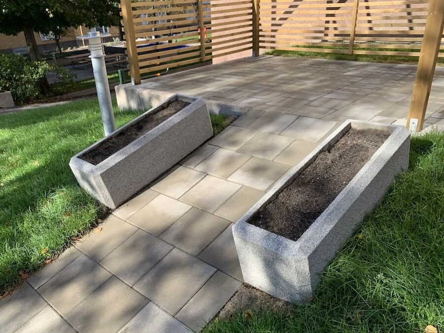 - Beton : Beton kræver ingen vedligehold. For at bevare et pænt udseende og mindske algevækst kan overfladen rengøres med vand og en stiv kost efter behov.