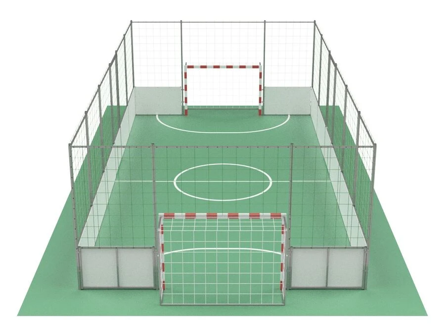Det beskyttende net, lavet af 4 mm polyethylen med en maskestørrelse på 10x10 cm, er monteret på solide stålstolper med en højde på 300 cm, hvilket effektivt holder bolden inden for banen og øger sikkerheden for både spillere og tilskuere.