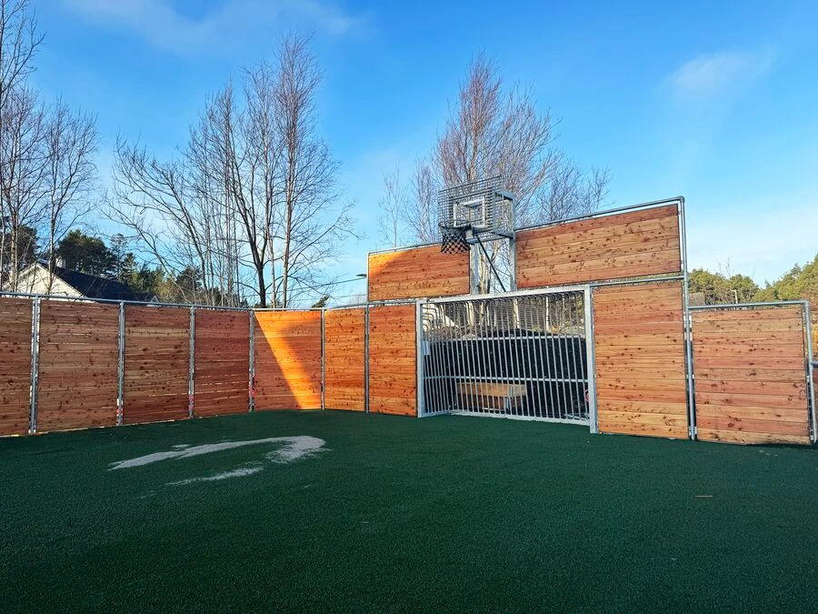Hjørnerne er skrå, så spillet flyder naturligt, og de inkluderede basketballudhæng over de 300 x 200 cm arenamål gør banen velegnet til flere typer boldspil. Med et spilleområde på 19,5 x 10 meter passer den perfekt til skolegårde, fritidsklubber og idrætsområder, hvor der er brug for et fleksibelt og populært samlingspunkt til sport og bevægelse.