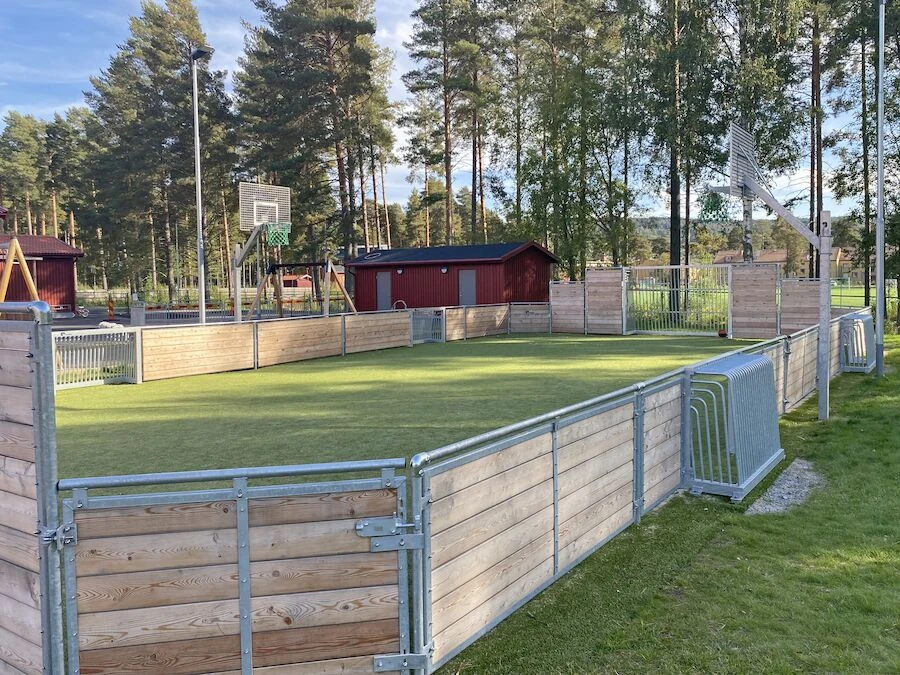 Toprør på baneender og langsider samt skråtstillede hjørnebander sikrer et velafgrænset spilområde. Et sidemodul fungerer som servicelåge, og målene er forberedt til eftermontering af basketmodul.