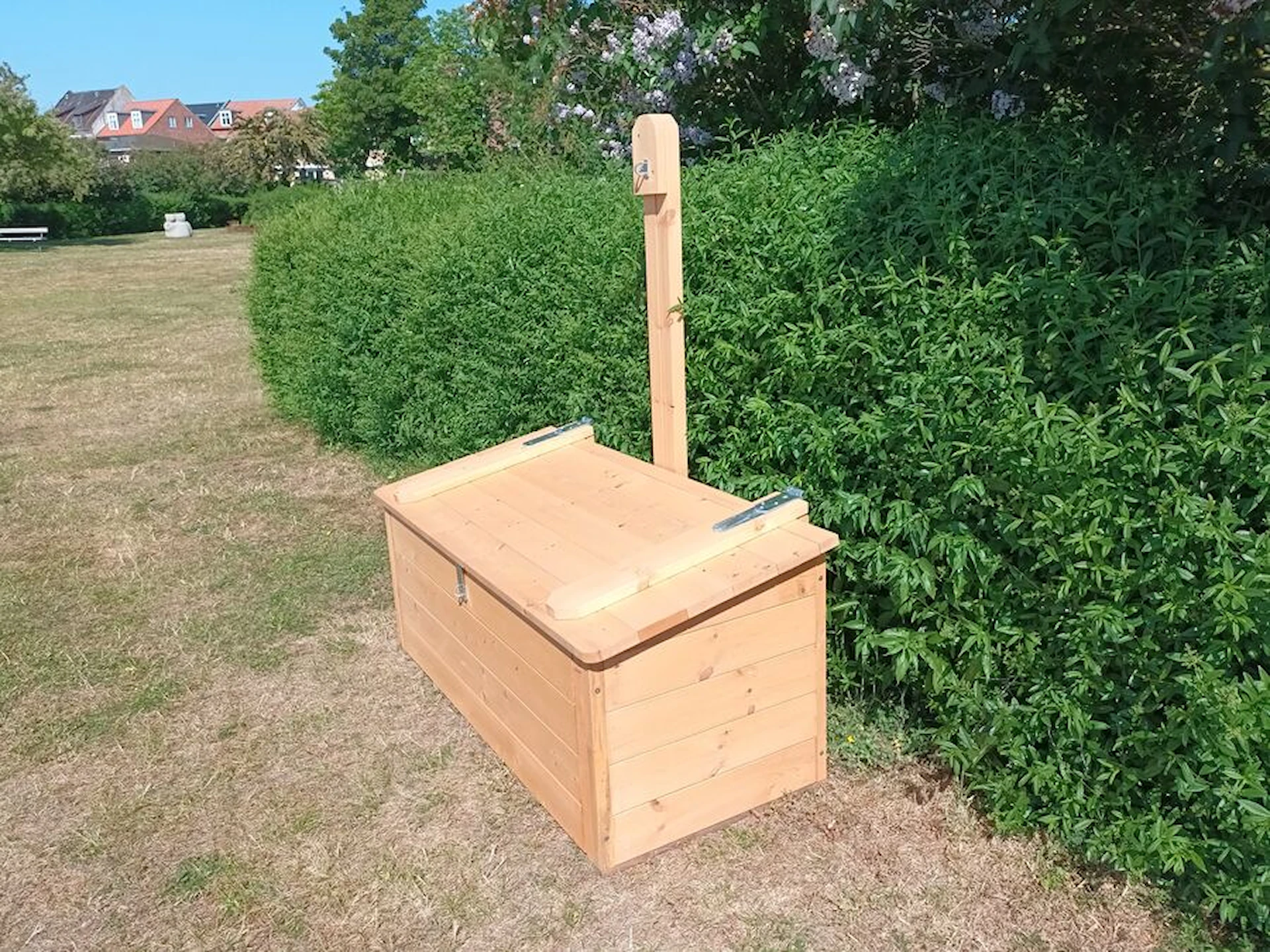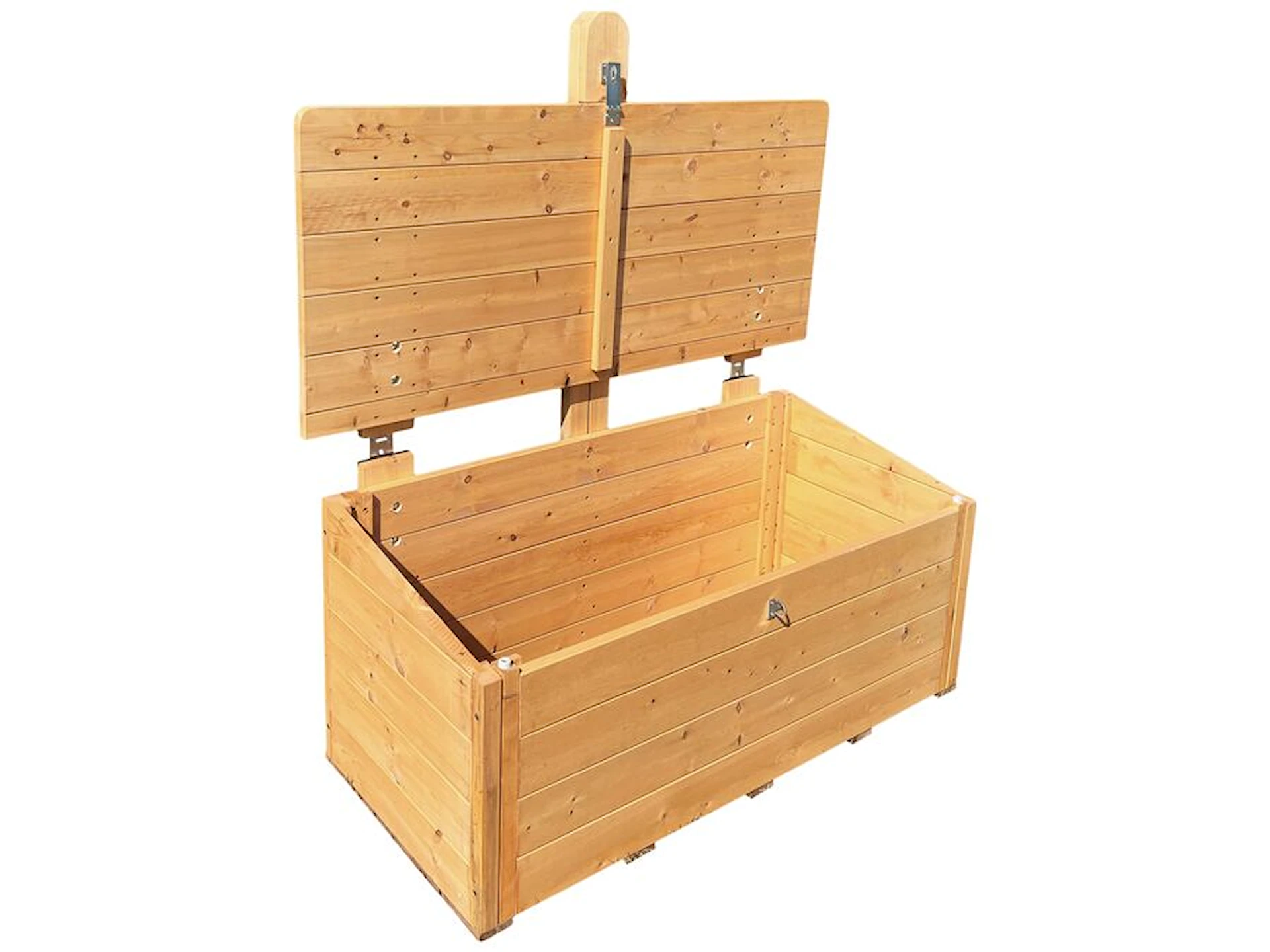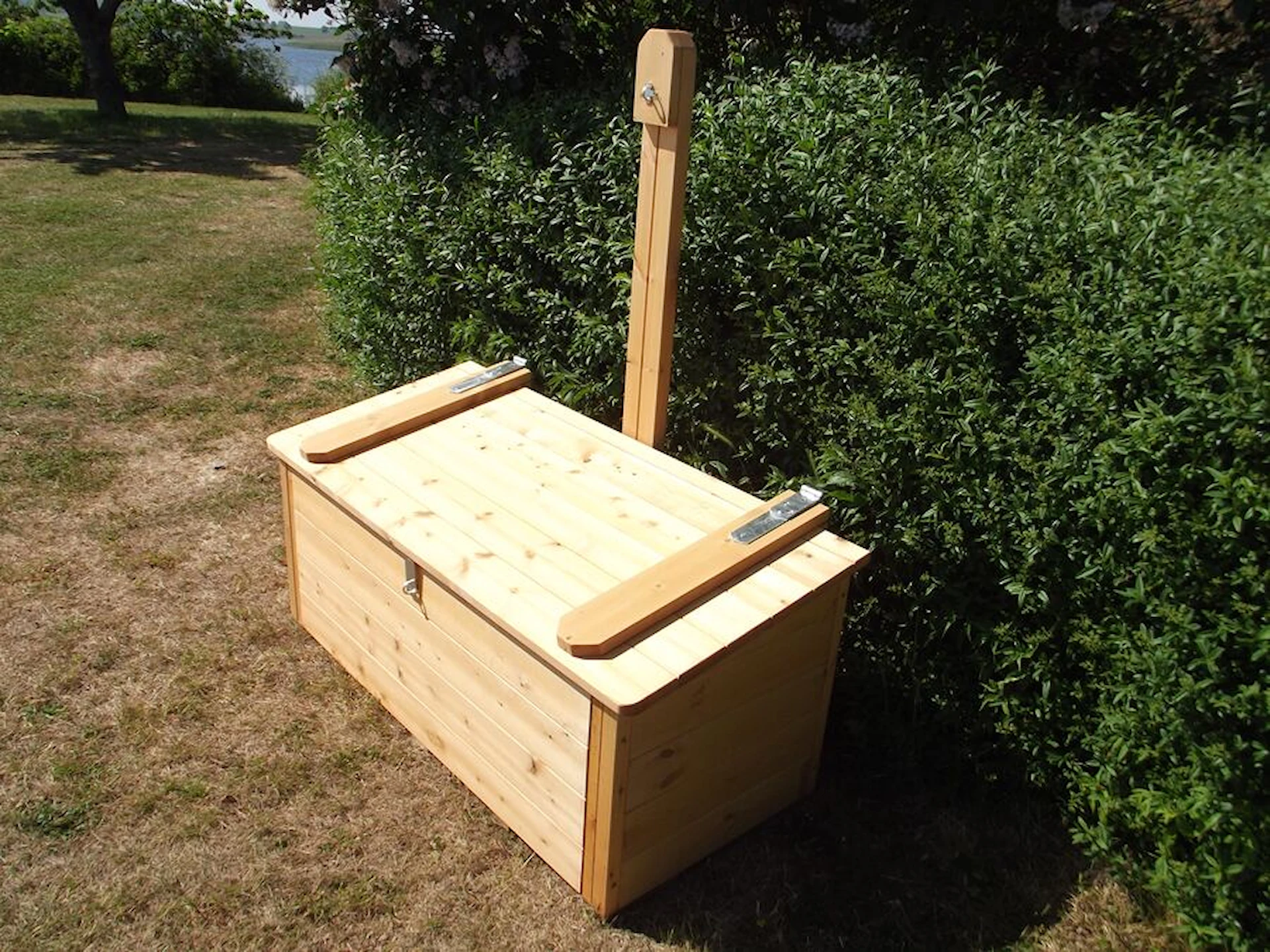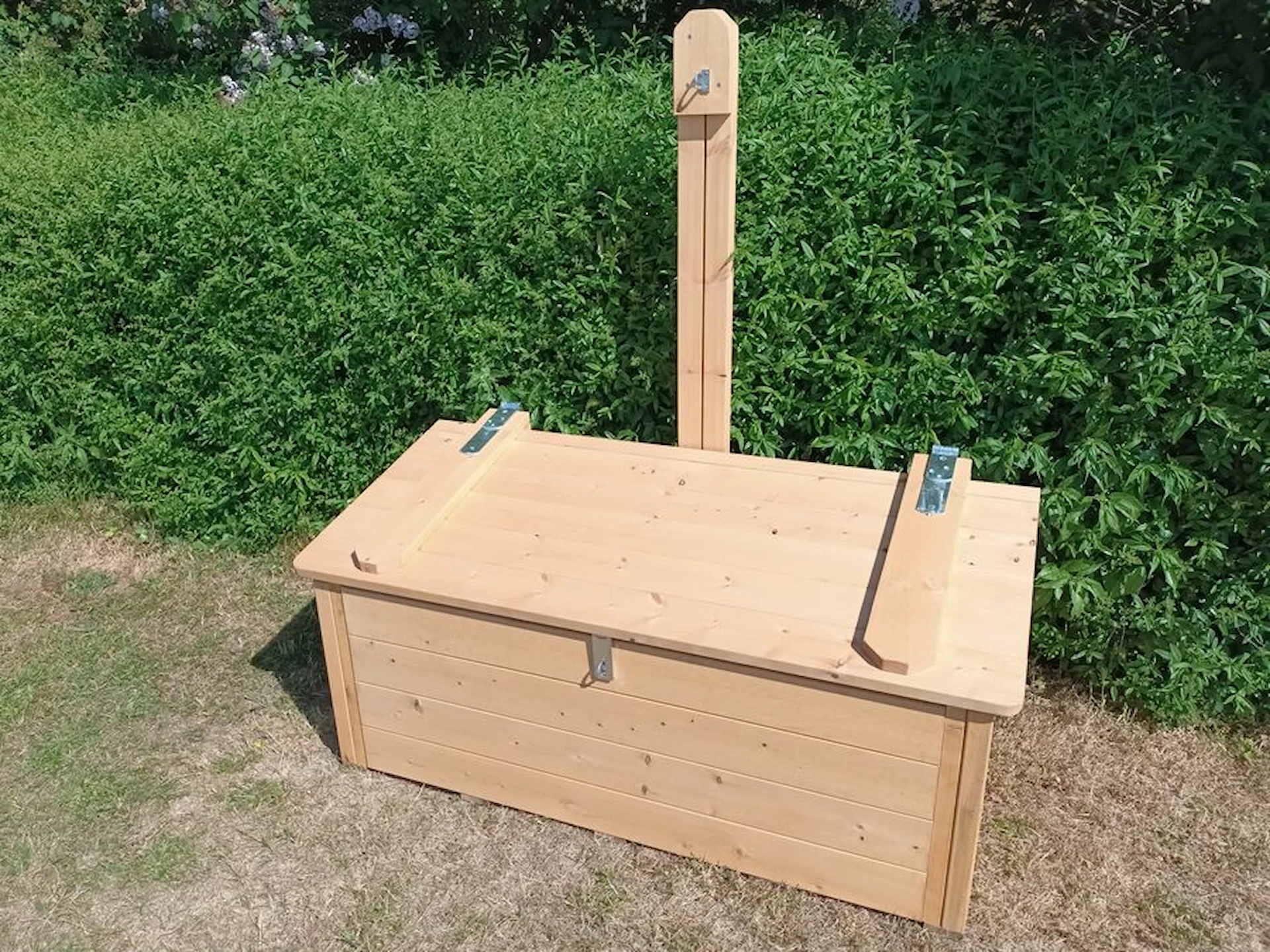 Den åbne bund tillader naturlig afledning af sand og vand. Højden gør det muligt for børn selv at nå indholdet, hvilket understøtter selvstændig leg og oprydning.