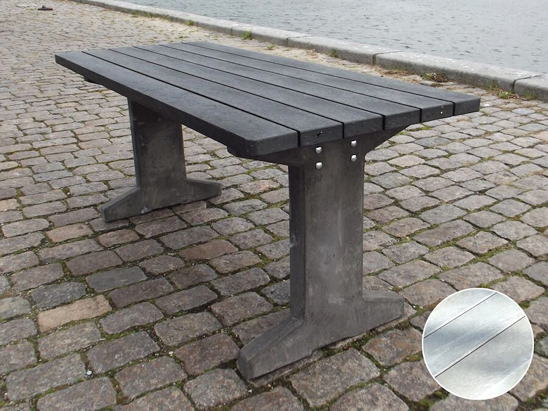 Bordet leveres med færdigsamlet bordplade og er forberedt til fast montering på underlag. Vælg mellem plastplanker i sort, brun eller grå. Et slidstærkt og vedligeholdelsesvenligt parkmøbel til helårsanvendelse.