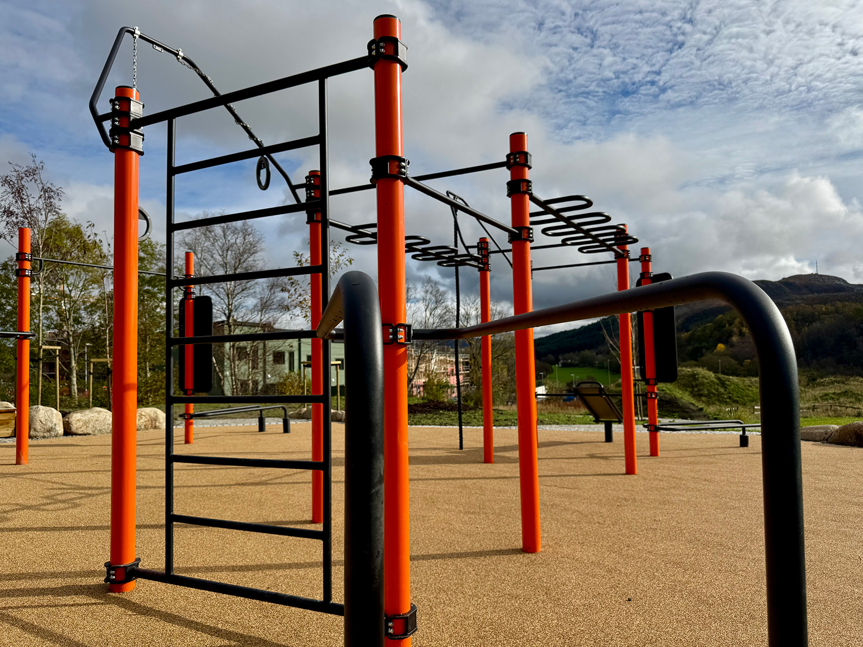 Midt i området står en stor træningsstation fra ElementFit – en alsidig Street WorkOut-station designet til både børn, unge og voksne. Stationens solide og robuste konstruktion gør det nemt for brugere på forskellige niveauer at træne sammen – fra korte pauser til længere træningssessioner. Et tydeligt instruktionsskilt hjælper brugerne med at få mest muligt ud af træningsmulighederne.