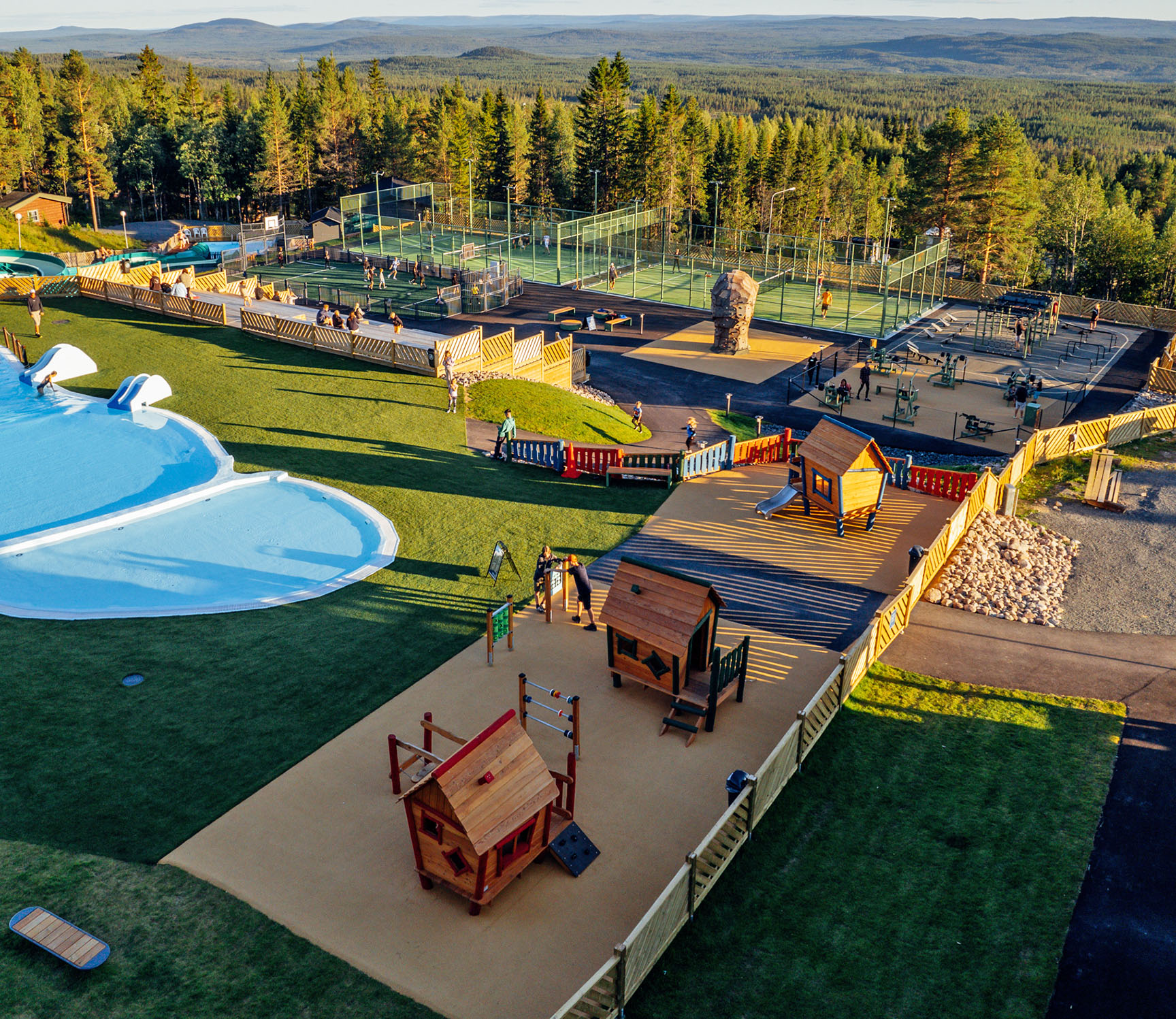 Vi arbejdede tæt sammen med Idre Fjäll for at opfylde drømmen om et aktivitetsområde med plads til både træning og leg for mennesker med forskellige forudsætninger. Det nye område stod klar lige i tide til sommersæsonen 2022. Her er der nu bl.a. et unikt OCR-forløb udviklet i samarbejde med Element Fitness, to padelbaner, boulder rocks, outdoor fitness, legeplads, svømmefaciliteter og en multiarena.