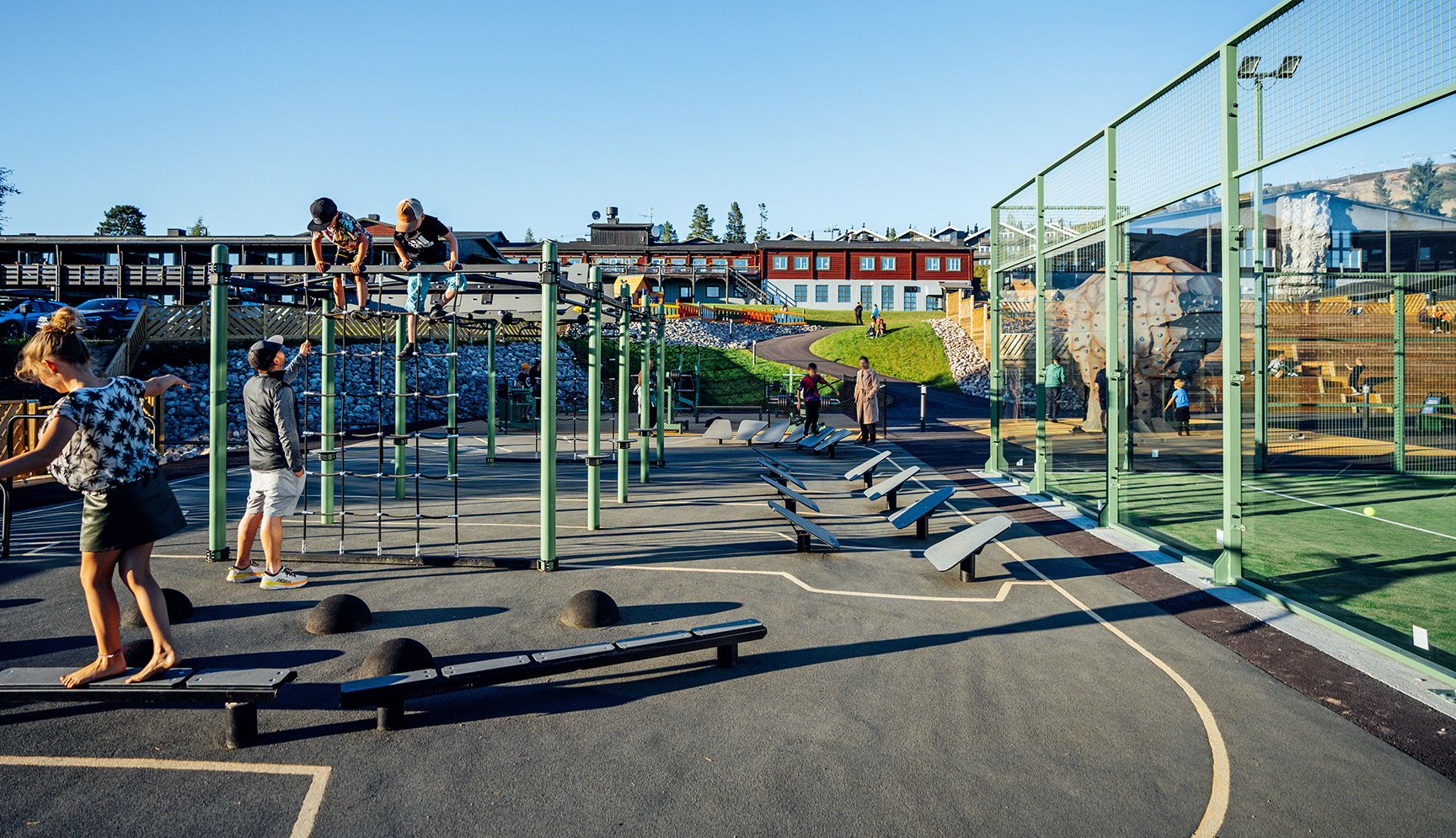 Uanset om du foretrækker boldsport, styrketræning, klatring eller ninjatræning, kan du finde din træningsfavorit på Idre Fjälls nye udendørs anlæg.