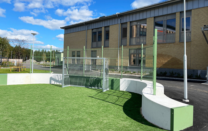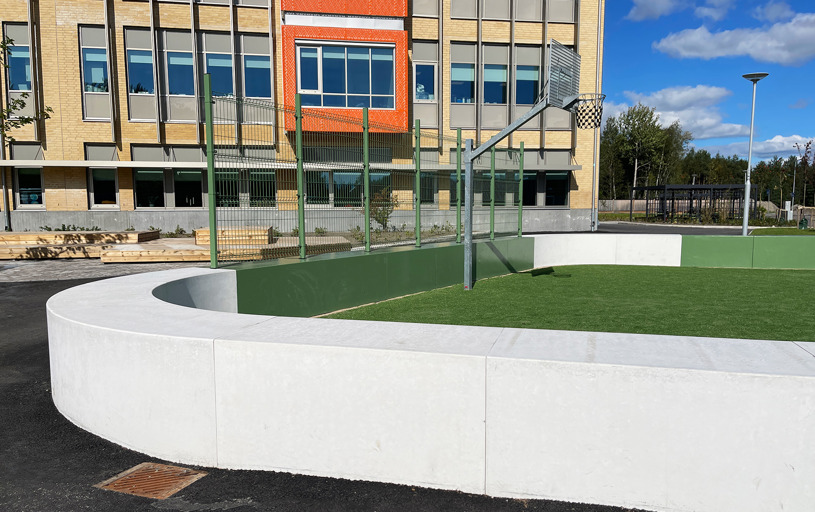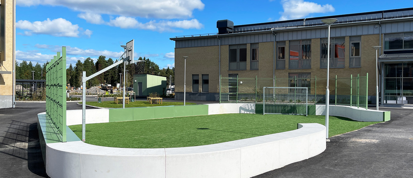 Den nybyggede Carlslundsskole i Umeå huser elever fra 7.-9. klasse og indretningen af skolegården skulle selvfølgelig matche aldersgruppen. Her findes derfor bl.a. en InsideOut multiarena, et parkourstativ, den store Boulder Rocks klatresten og udendørs bordtennisborde. Alt stål er pulverlakeret i den flotte RAL-farve 6011 Reseda Green, som matcher skolegårdens omgivelser.