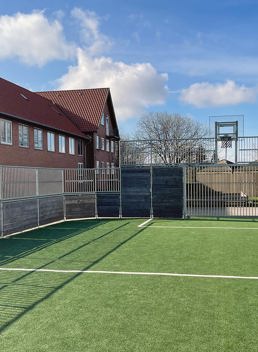 Legeområdet blev udvidet med et solidt gyngestativ, der rummer både klassiske sæder og en populær fugleredegynge, mens den store nedgravede trampolin giver børnene mulighed for at hoppe, lege og træne balance på en sikker måde. Den robuste metalkarrusel fungerer som et naturligt samlingspunkt, hvor mange kan være med samtidig, og som ekstra overraskelse tilføjede skolen en Boulder Rock, der giver nye klatremuligheder med trygge udfordringer i flere niveauer – perfekt til børn, der vil udforske, finde egne ruter og styrke både mod og motorik.