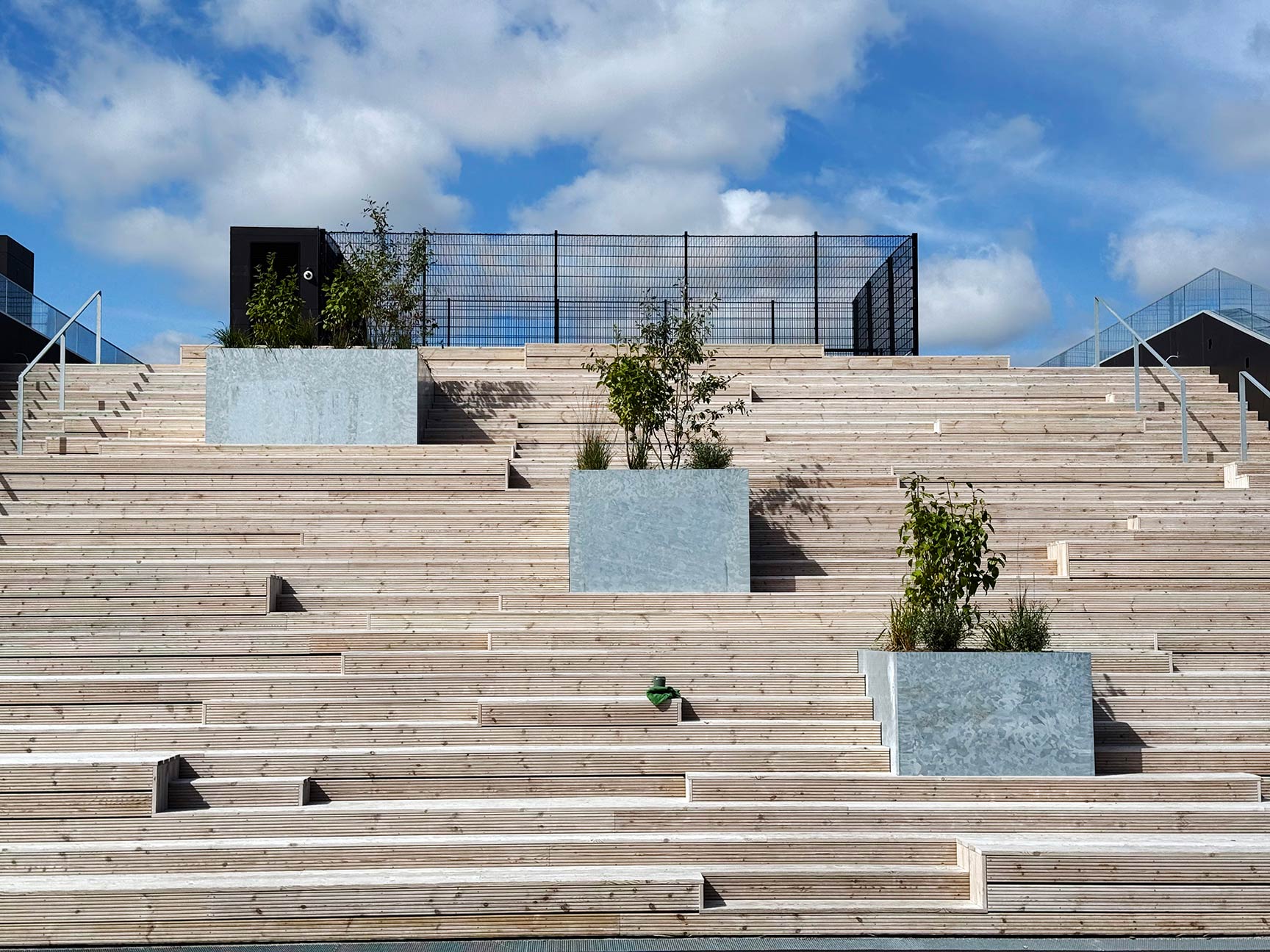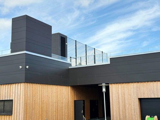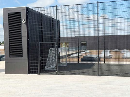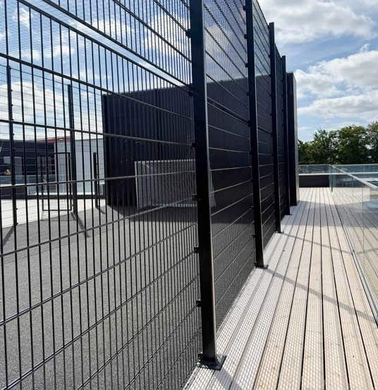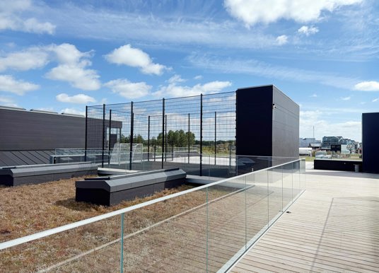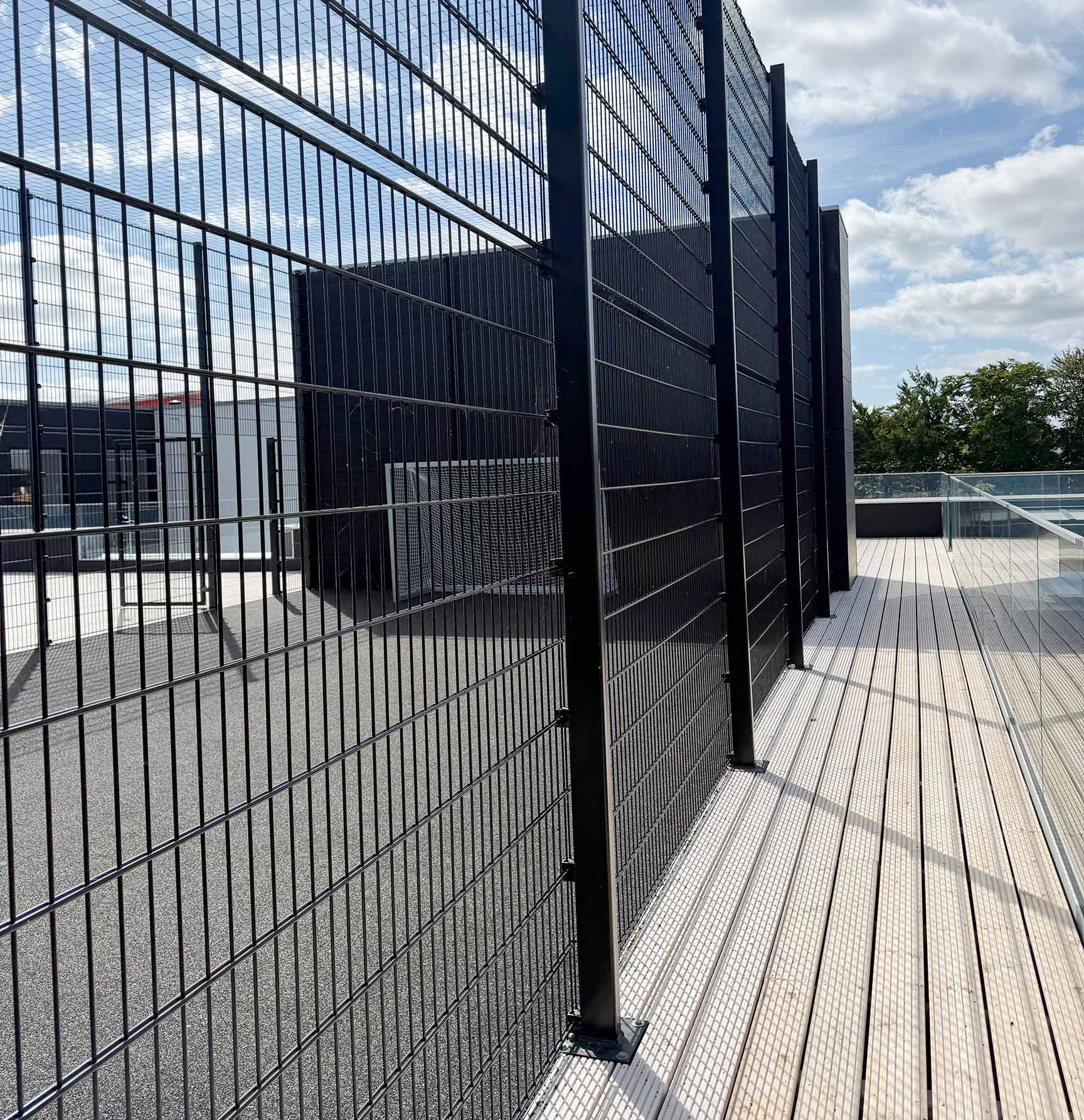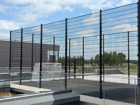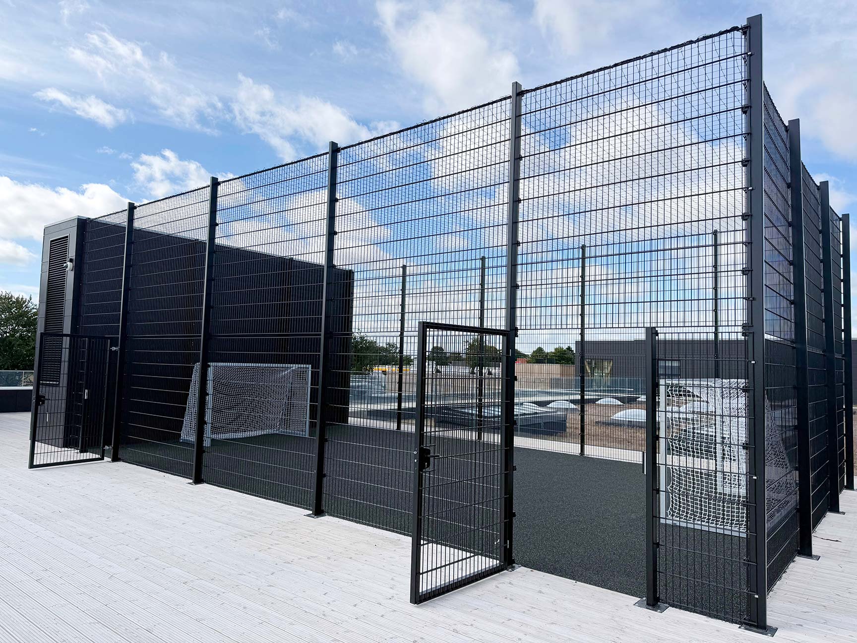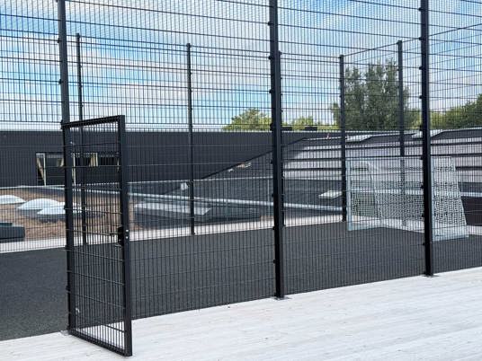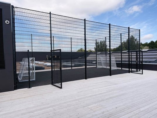 Da boldbanen er placeret på taget, stillede projektet særlige krav til konstruktionen. Det specialtilpassede panelhegn blev derfor produceret i samarbejde med en fast partner. Hegnet er udført i kraftige stålpaneler med ekstra højde, så boldene bliver sikkert på banen – uden at gå på kompromis med det lette, transparente udtryk, der understøtter skolens moderne arkitektur.