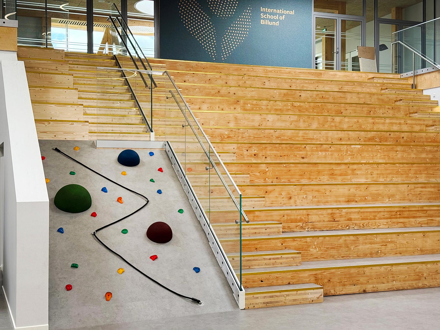 Ud over boldbanen leverede TRESS også en specialløsning til skolens indendørs læringsmiljø. Ved siden af den brede trappe er der skabt et klatreområde med farvede klatregreb, et dynamisk klatrereb og specialfremstillede halve klatrekugler i forskellige farver.