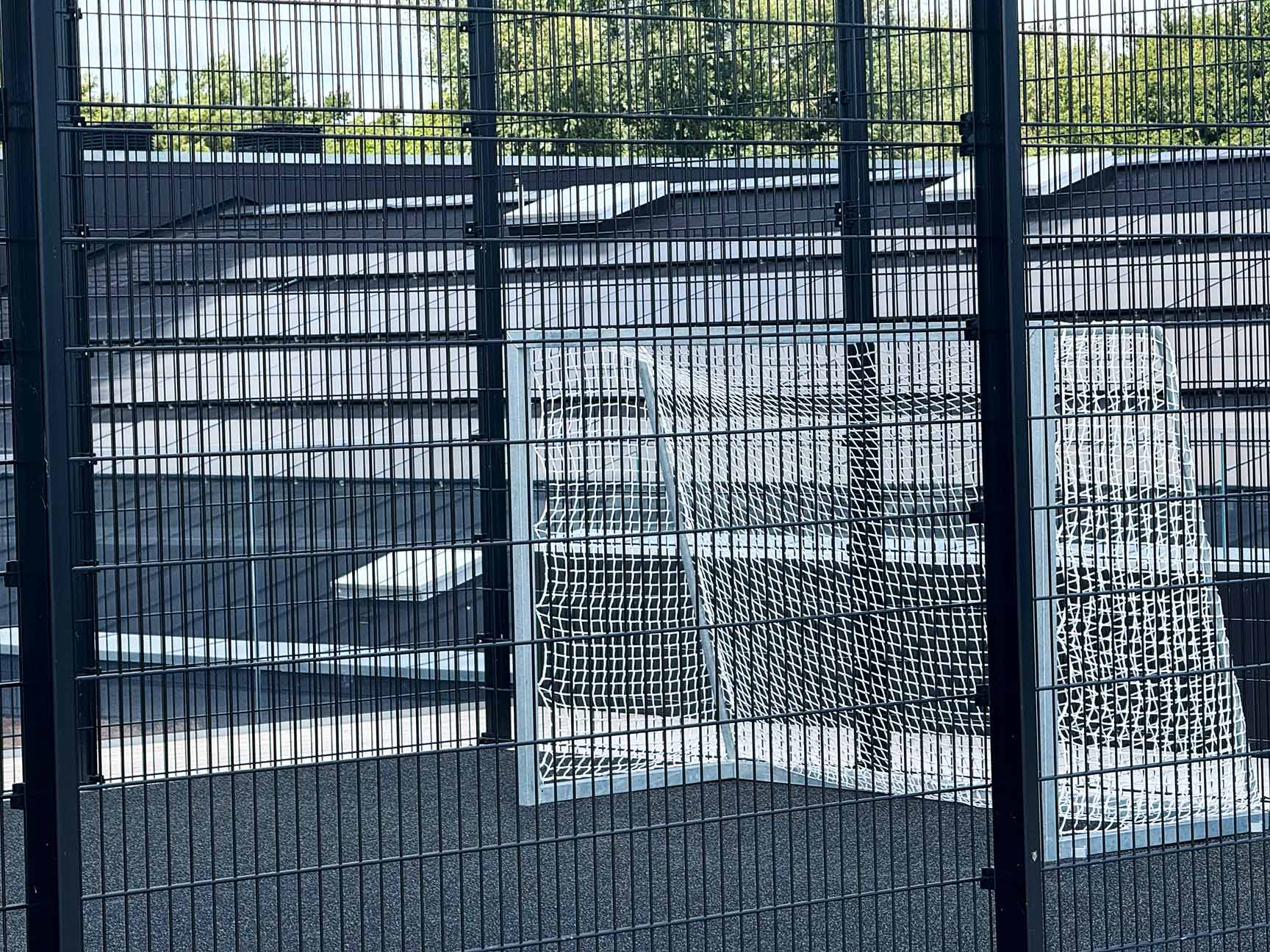 Det høje, robuste panelhegn er produceret af en fast samarbejdspartner. Konstruktionen imødekommer de tekniske krav til tagfundering og intens boldspilsbrug.