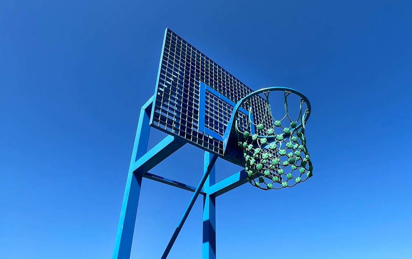 Multibanen kan leveres i forskellige farver. Fiskeriskolens multibane blev naturligvis lavet i maritime farver med en klar blå, som skiller sig flot ud i landskabet.