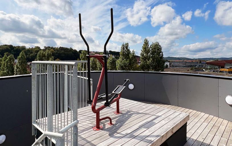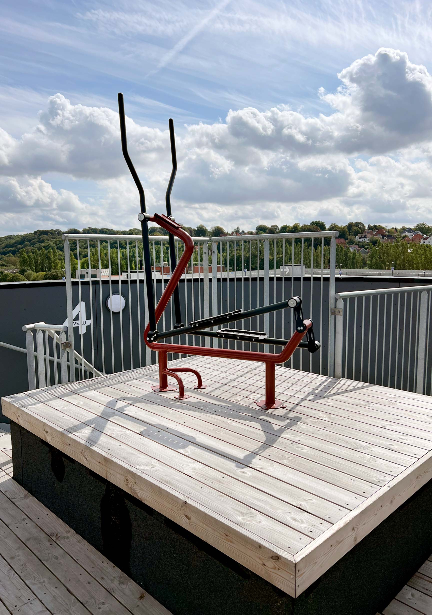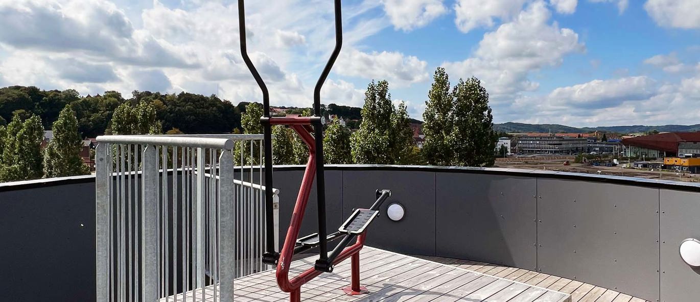 Crosstraineren er en åben invitation til bevægelse for de bilister, der parkerer på p-husets tag. Træningsmaskinen er let tilgængelig og kan bruges af alle.