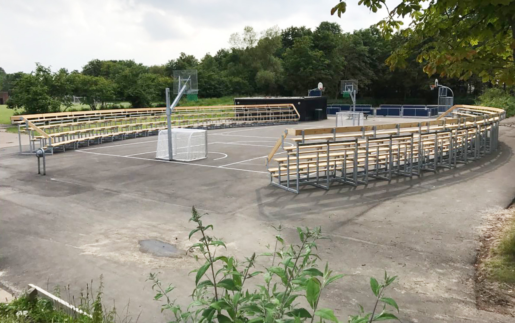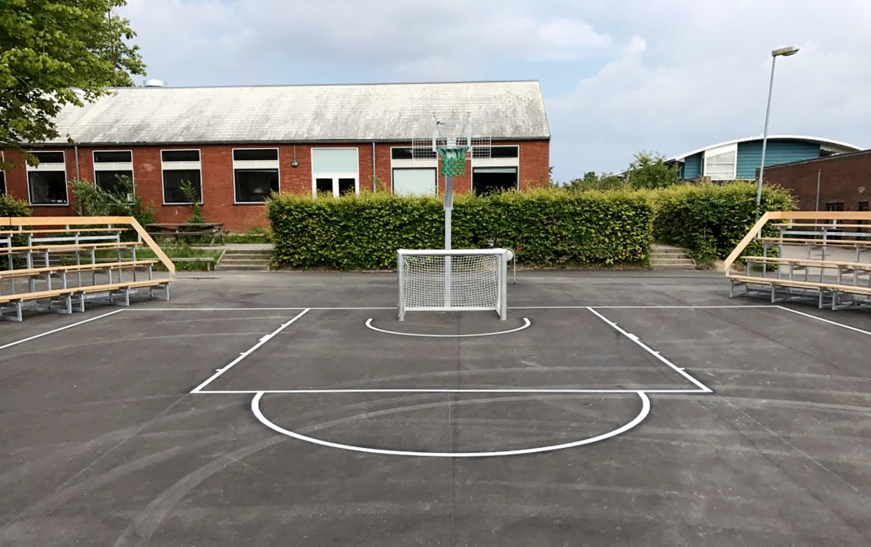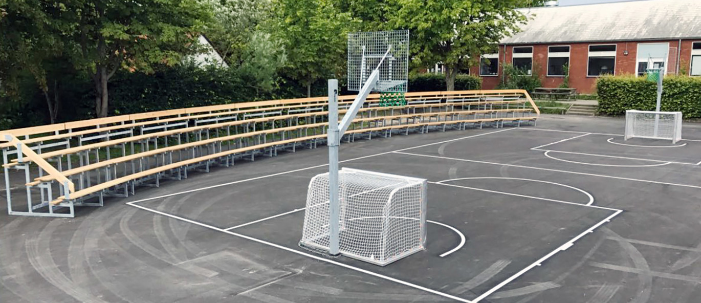 Basketball-arenaen blev udstyret med vores populære Goliath basketballstativ, som er både stabilt og vedligeholdelsesfrit. Banens linjer blev optegnet med skridsikker, miljøvenlig og UV-bestandig asfaltmaling.