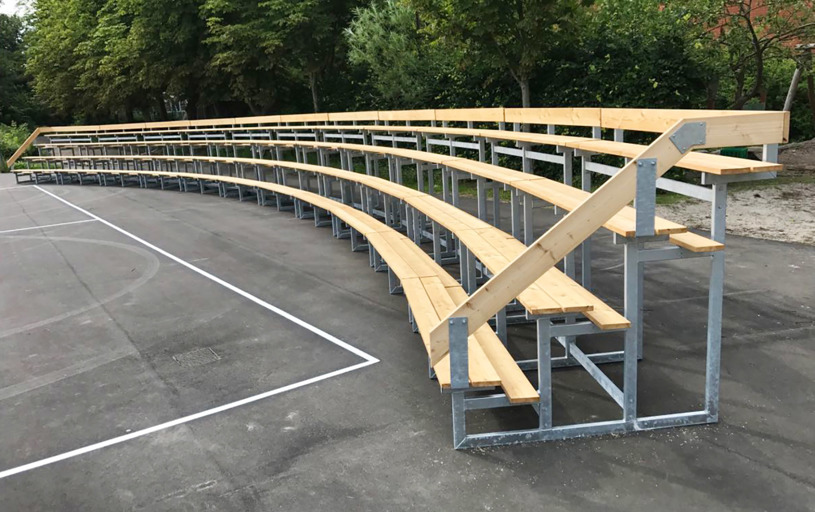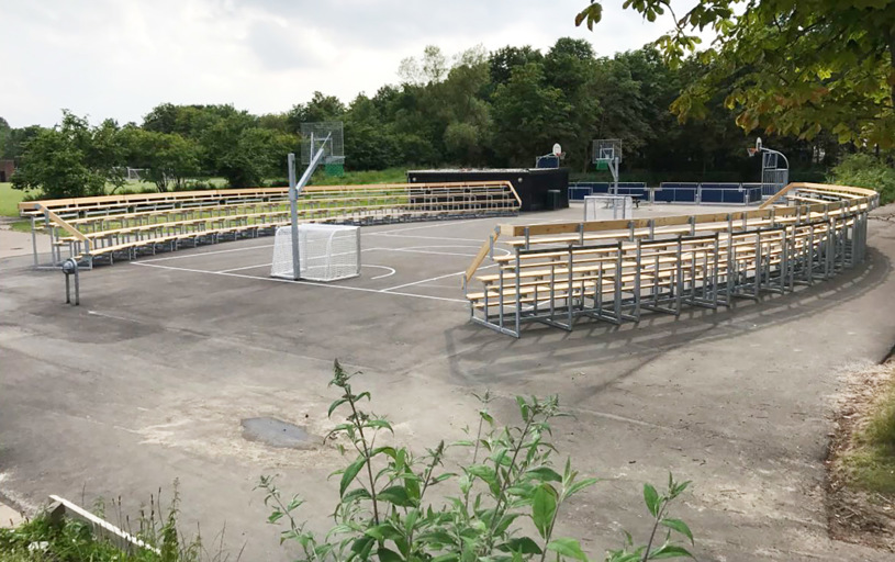 Tribunerne rundt om arenaen blev specialdesignet til skolens behov og areal. De mange siddepladser giver god mulighed for at samle årgangene – og kan fx bruges til udendørs undervisning.