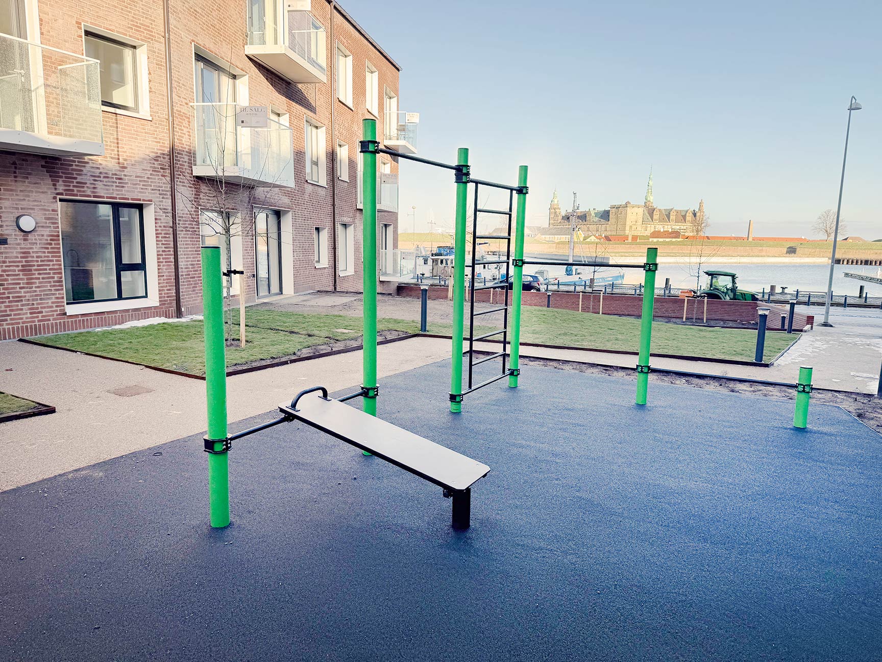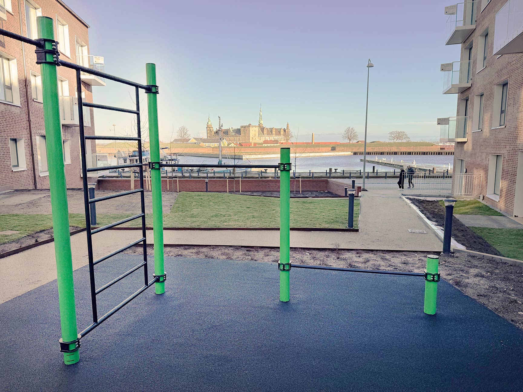 Det udendørs fitnessstativ giver beboerne mulighed for at træne med udsigt til Helsingør havn og Kronborg Slot. En placering, der kombinerer hverdagsmotion med byens særlige stemning.