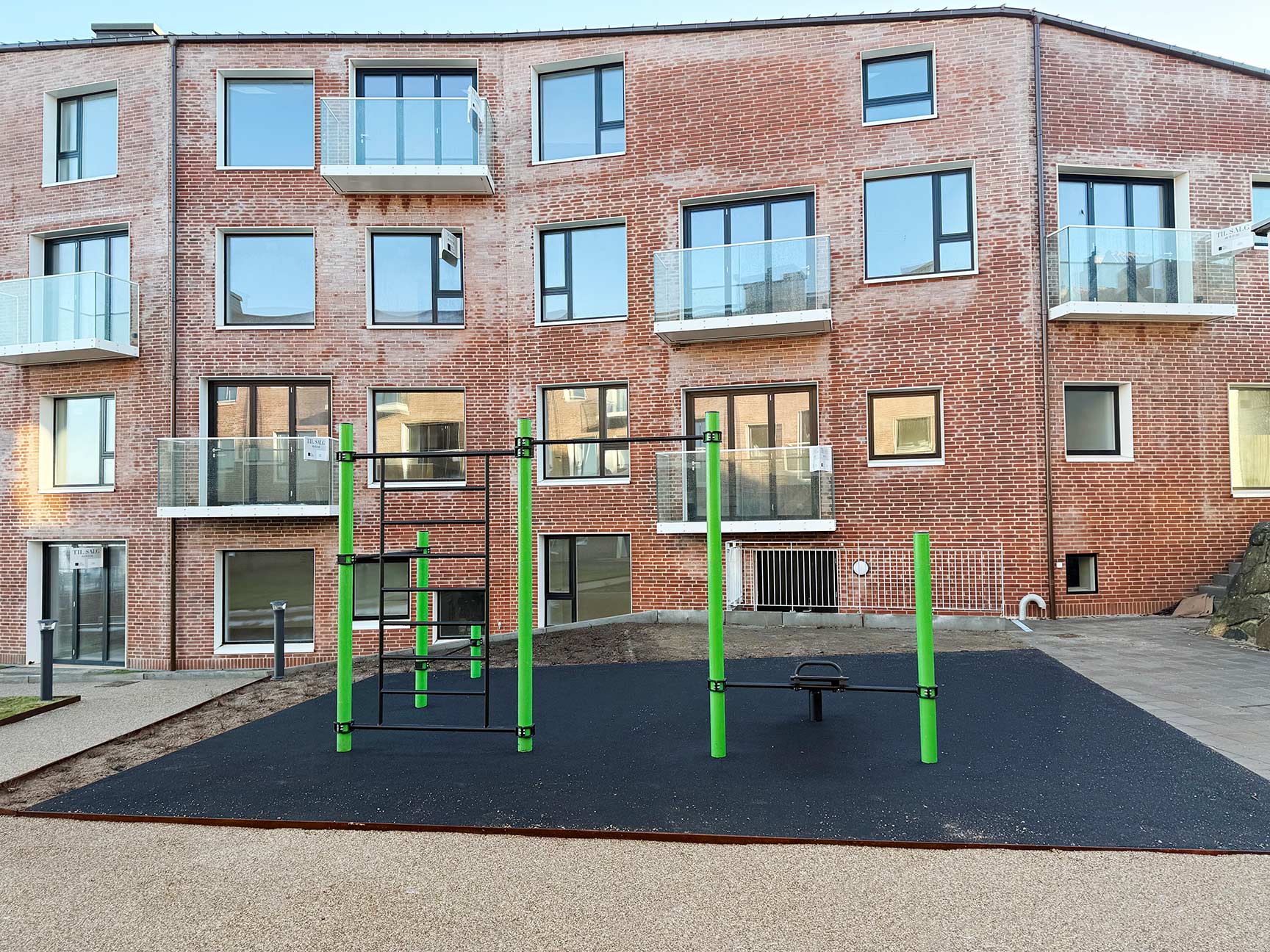 Det udendørs fitnessstativ er placeret, så det understøtter gårdrummets funktion som fælles mødested. Her kan beboere i alle aldre bruge kroppen aktivt – uanset om det er korte træningspas, funktionel styrketræning eller let bevægelse i hverdagen.