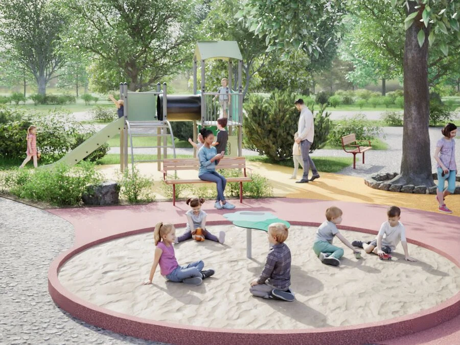 Den integrerede sandbeholder i metal gør det nemt at øse, si og forme sandet og understøtter både rolleleg og fordybelse. Legeelementet indbyder til fælles leg, hvor børn deler redskaber, idéer og legeforløb i et roligt tempo.