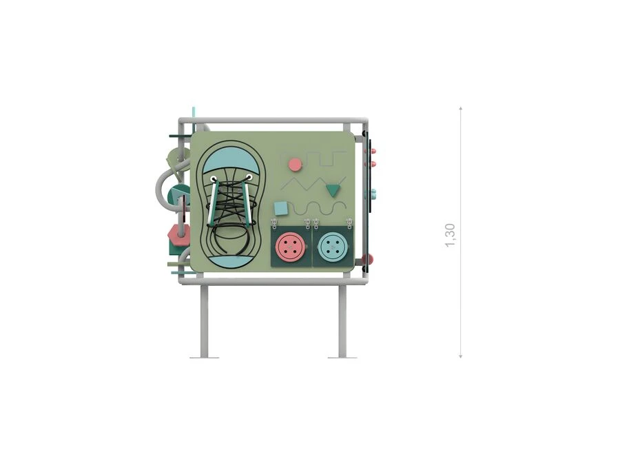 Hver side er udviklet til at træne finmotorikker, øje-hånd-koordination og sensorisk udforskning via forskellige overflader, former og farver. Stationens design inviterer til kreativitet, fantasileg og sjove små læringsøjeblikke i barnets eget tempo.