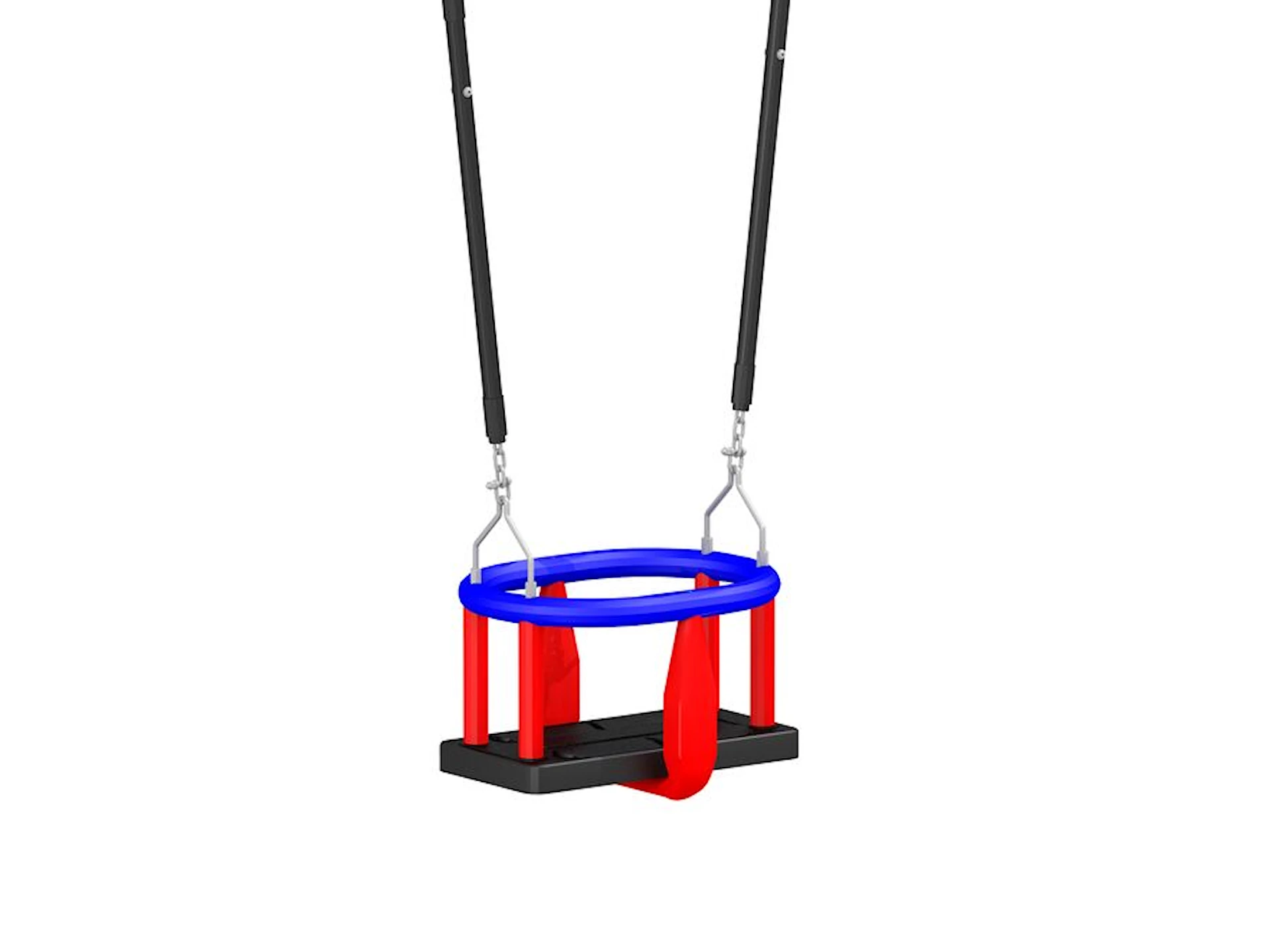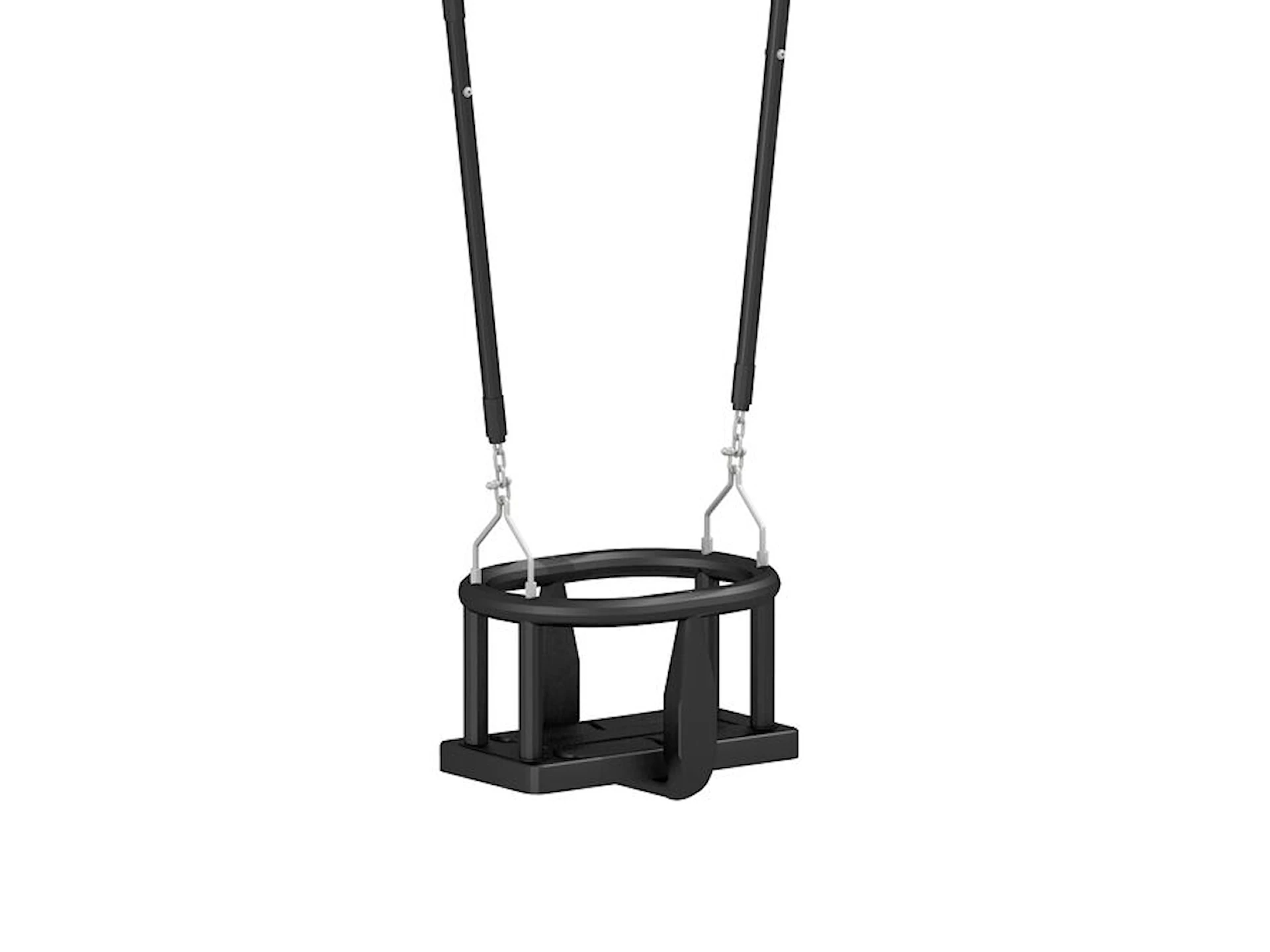 Gyngens beslag og kæder er fremstillet i rustfrit stål og leveres med gummibeskyttelse, som skærmer mod vejrpåvirkning og giver en behagelig overflade at holde ved. Den lukkede sædekonstruktion sikrer, at barnet sidder trygt og ergonomisk korrekt under hele gyngeturen.
