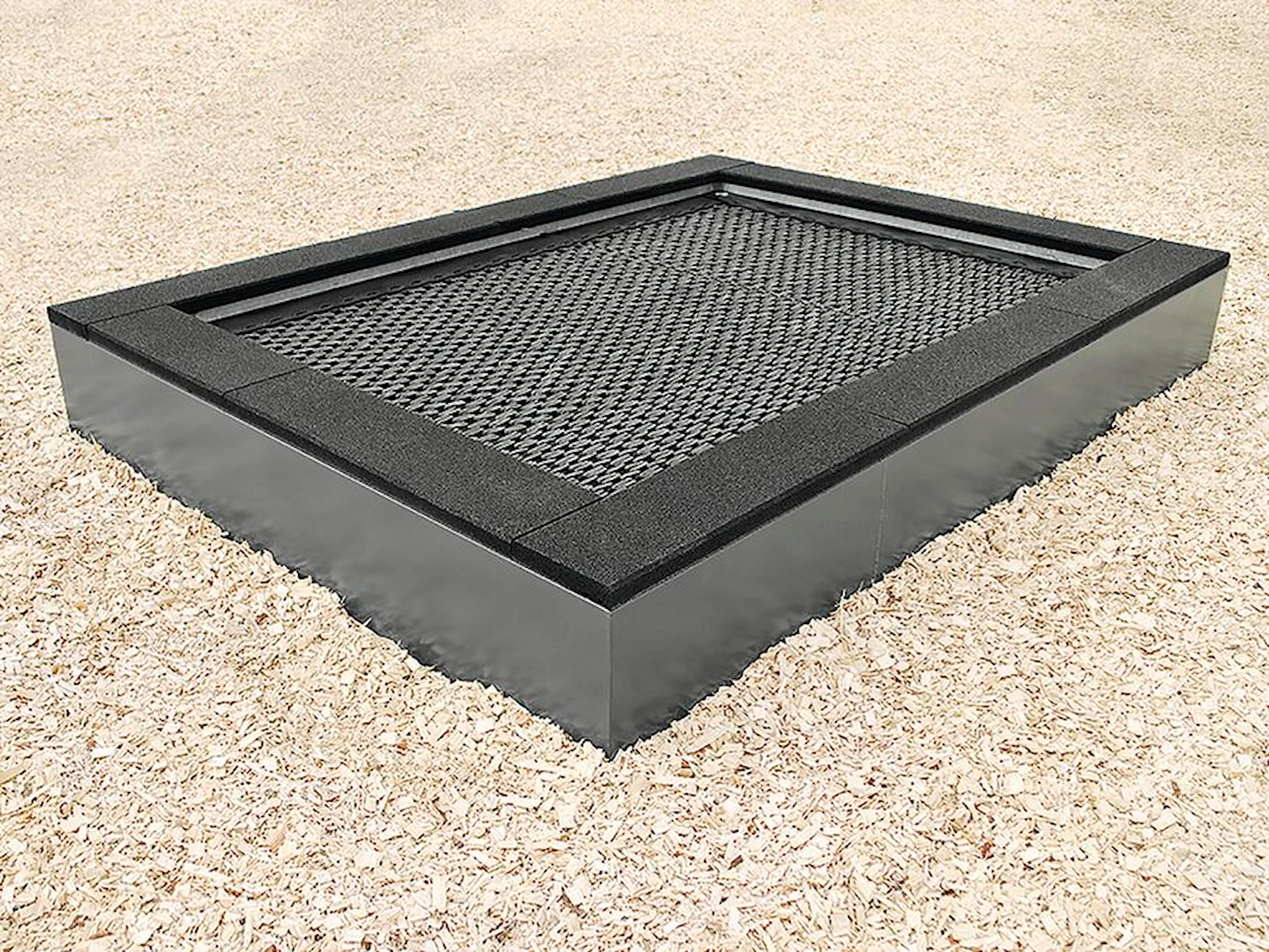 De ydre mål er 300 x 225 cm, og det anbefales at afsætte et sikkerhedsareal på 650 x 575 cm. Kantbeskyttelsen fås i sort eller rødbrun, og der kan bestilles andre farver efter ønske. Trampolinen er TÜV godkendt og klar til brug som fritstående model.
