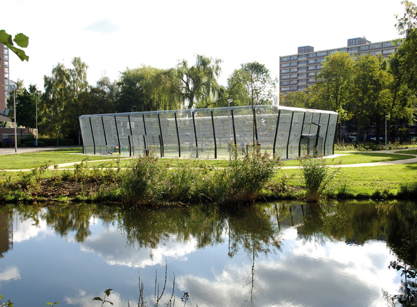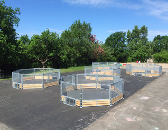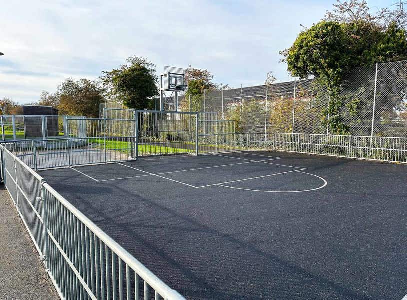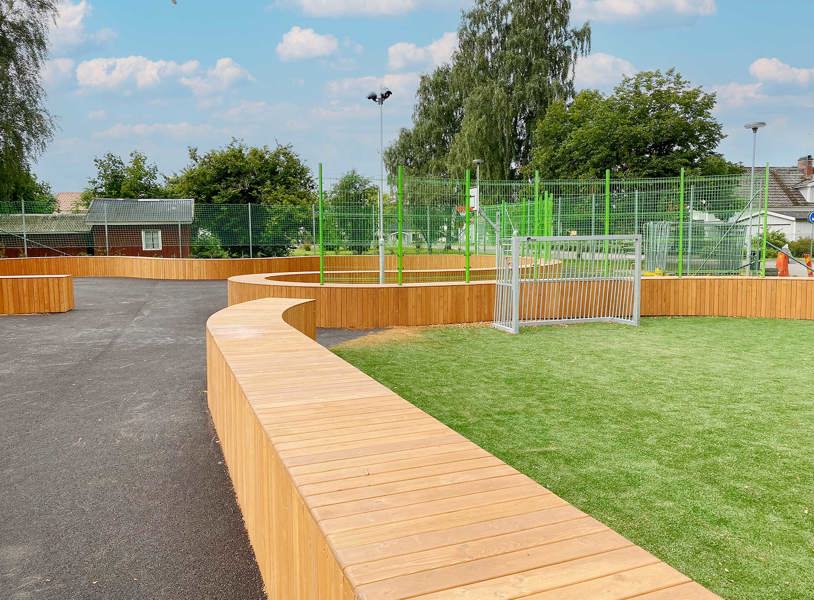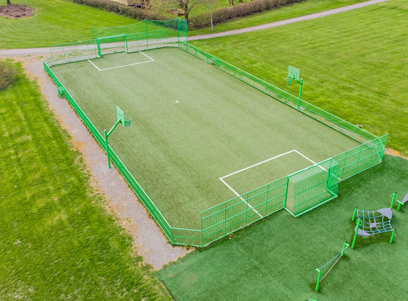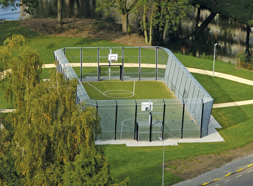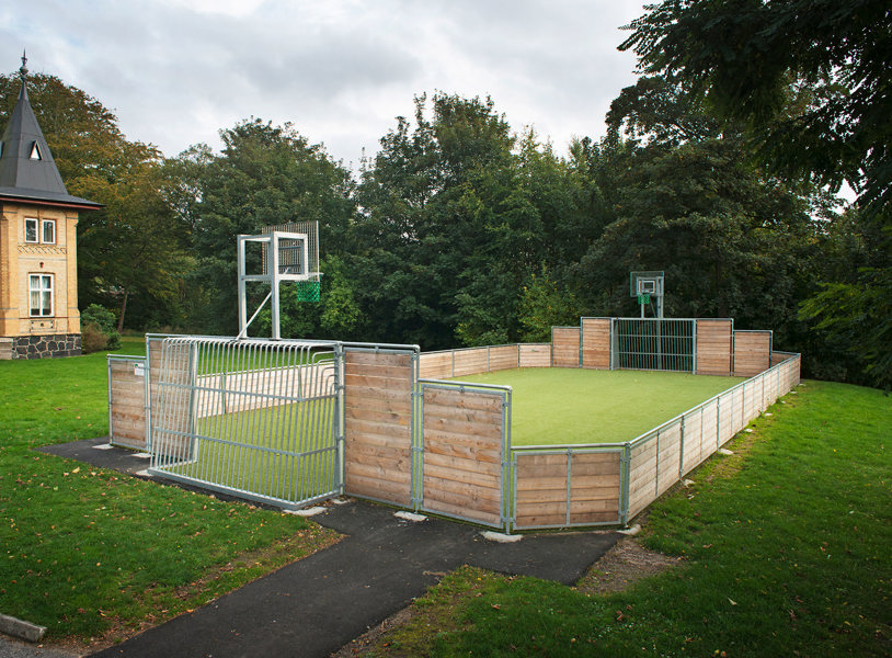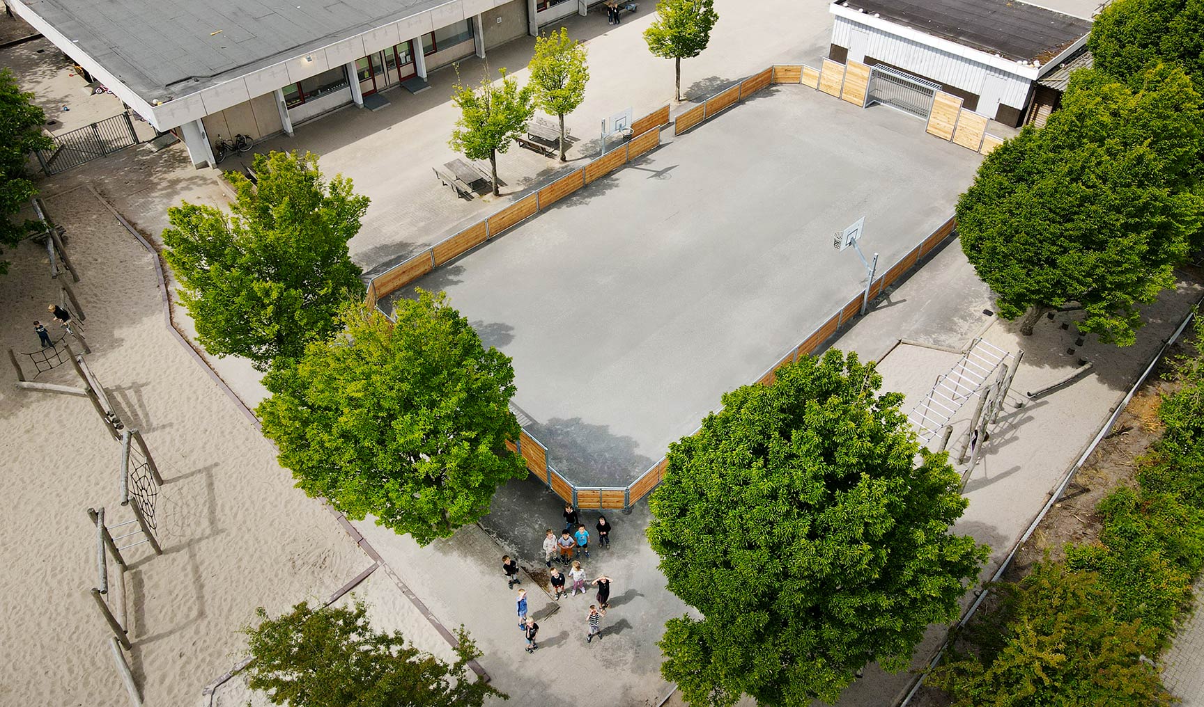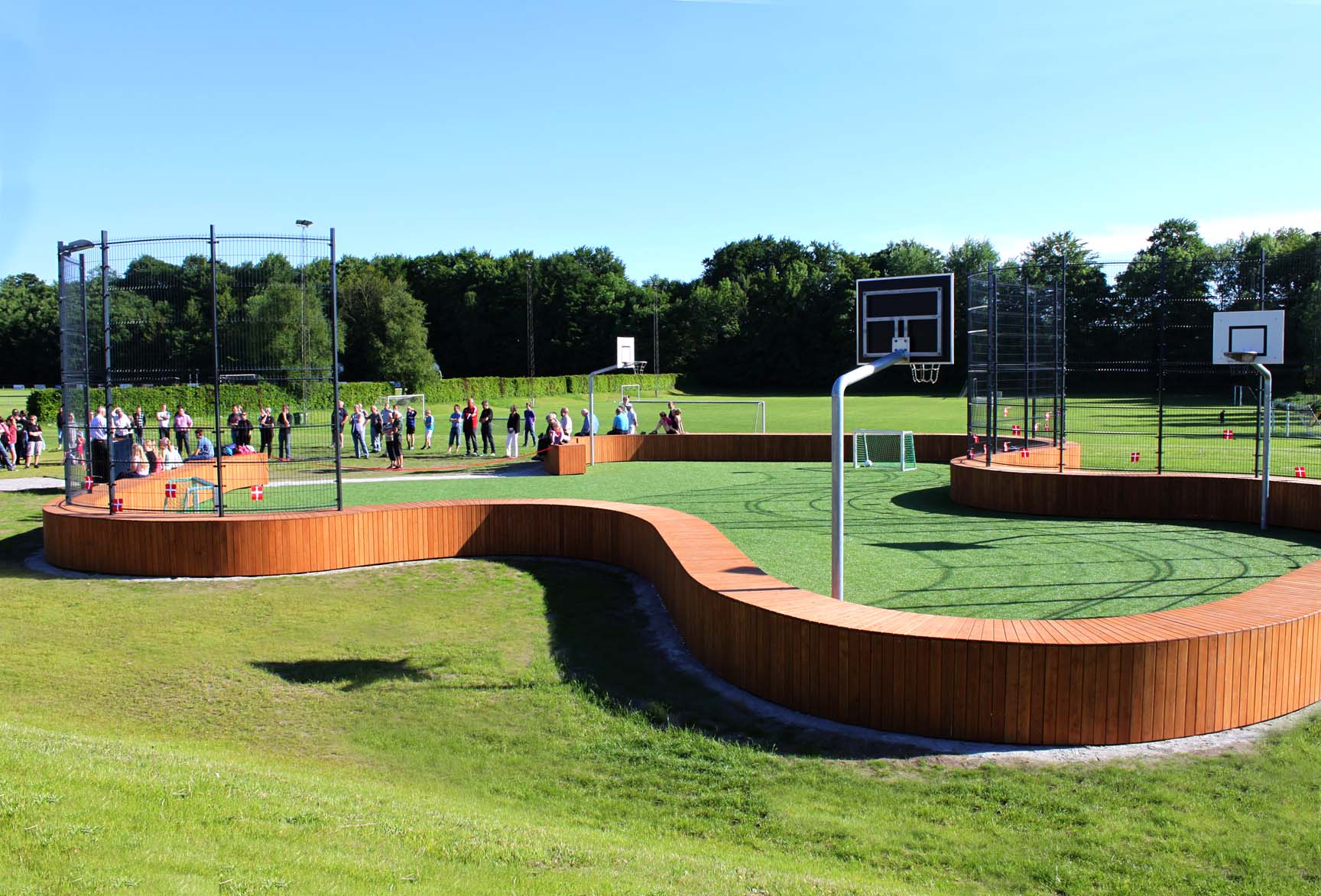 Den markante konstruktion og det rumlige design giver oplevelsen af en rigtig idrætsarena, hvor spillet får en tydelig ramme og tiltrækker opmærksomhed. Det gør banen til et naturligt samlingspunkt, som skaber liv og aktivitet i området.